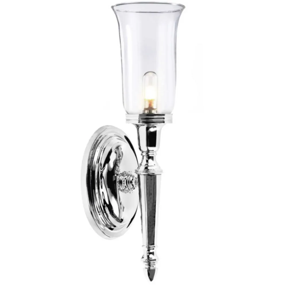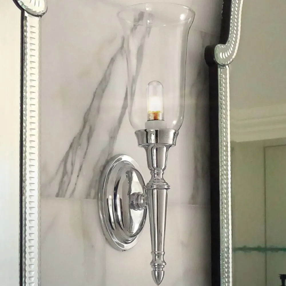DRYDEN spejllampen er både enkel og yderst elegant med sin opale glasskærm og stellet, der minder om en vægfakkel. Spejllampen er udviklet speciel til brug på badeværelser og er i stand til både at forsyne et sådant rum med et praktisk anvendeligt lys i området omkring spejlet samt at tilføre et indretningselement, der skaber velvære med sit elegante udseende.