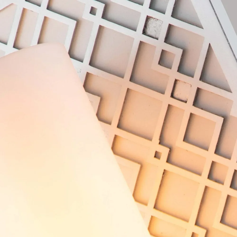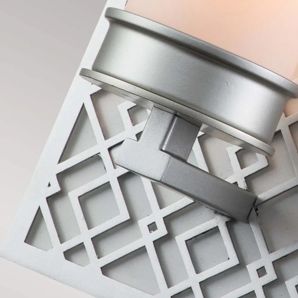 Ziggy væglampe med grafisk mønstret vægelement Ziggy er en væglampe, der er et blikfang på enhver væg. Det sølvfarvede vægbeslag i lakeret metal er dekoreret med et grafisk mønster og giver lampen et sofistikeret look. En rørformet skærm af hvidt glas sidder på den sølvfarvede fatning, som er fastgjort til det lille beslag nederst på vægbeslaget, hvilket giver blændfrit lys og en behagelig atmosfære i rummet. Ziggy-væglampen er perfekt som en ekstra lyskilde i stuen eller som et stilfuldt højdepunkt i soveværelset – kan dæmpes udefra