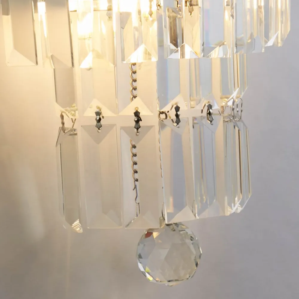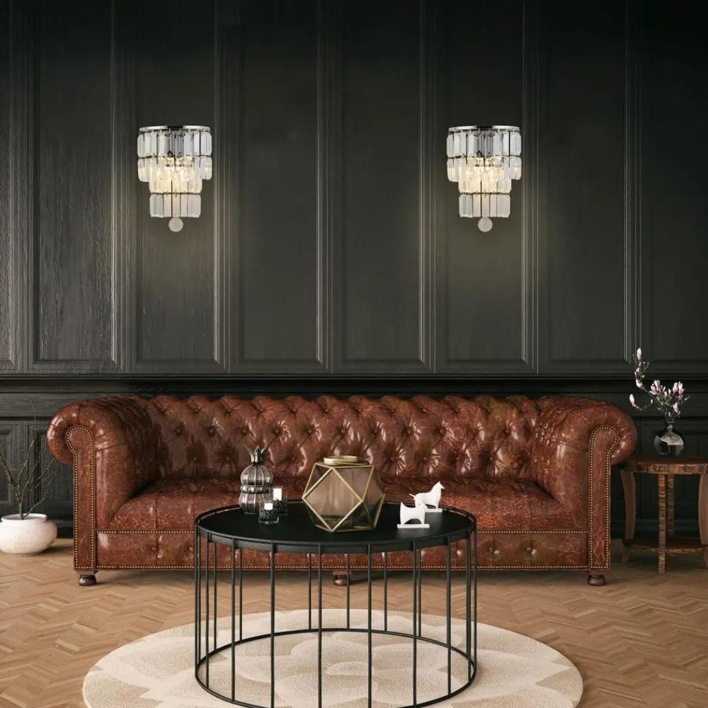 Empire væglampe med kaskader af krystalglas Empire væglampen giver blændende belysning og glamour til ethvert rum, også badeværelser, takket være kapslingsgraden IP44. En skinnende metalramme er udstyret med glitrende, smukt slebne glaspendler arrangeret i en kaskade, der kulminerer i en betagende krystalpendel. De to pærer (medfølger ikke) oplyser krystallerne smukt og skaber et strejf af glamourøs elegance. Dette alsidige møbel vil tilføje et strejf af glans til ethvert soveværelse, stue, spiseplads eller gang.