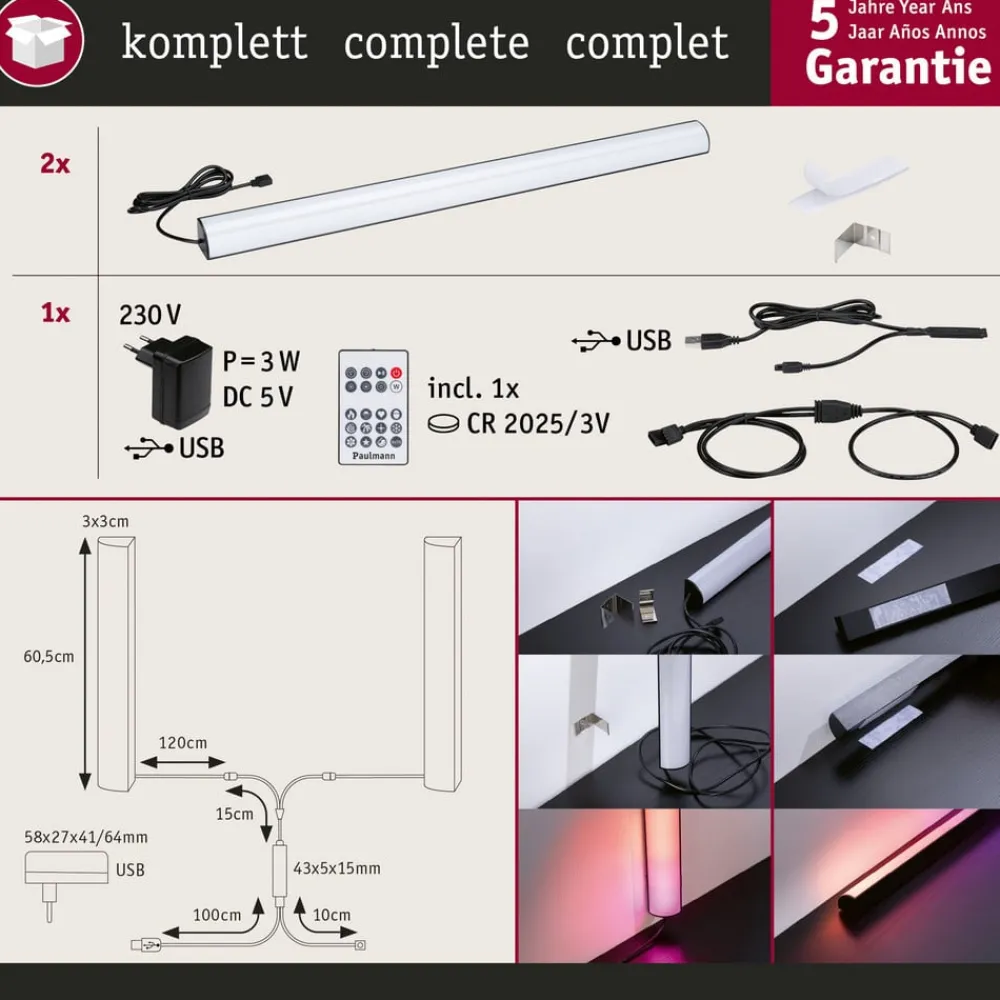 Praktisk dobbeltpakke: EntertainLED Dynamic RGB Lightbars med RGB-farveskift, inkl. fjernbetjening, dæmpbar EntertainLED Dynamic RGB Lightbars fra Paulmann fås her i et sæt med 2 stk. Som indirekte omgivelseslys skaber de effektive lysaccenter med deres behageligt rolige, skiftende, dynamiske farvespil. De elegante aluminiumsprofiler sætter scenen i hjemmets underholdnings- og gamingområder. Den praktiske styring via infrarød fjernbetjening (inkl. 1 x batteri) gør det til en leg at konfigurere utallige brugerdefinerede farvesekvenser og hastigheder.Profilerne leveres klar til tilslutning og er straks klar til brug. De kan placeres vandret på det ønskede sted i rummet, f.eks. ved siden af pc-skærmen eller tv’et. Alternativt kan de fastgøres med selvklæbende velcrobånd eller en skrubar metalclips (inkluderet i leveringen), hvis det er nødvendigt. Derudover kan der fås stativer (se tilbehør), som de dynamiske lysstænger kan placeres lodret med. Alt efter behov kan lysbjælkerne tilsluttes direkte til en USB-port eller betjenes via en stikadapter på en stikkontakt.Tekniske egenskaber- praktisk sæt med 2 RGB-farveskift med forudindstillede, tilpassede lysscener- kan dæmpes trinløst via fjernbetjeningen- hukommelsesfunktionen gemmer det sidst anvendte niveau, indtil næste gang den tændes- inklusive fjernbetjening (med batteri), USB-stikforsyningsenhed, selvklæbende velcrobånd og metalclips til montering