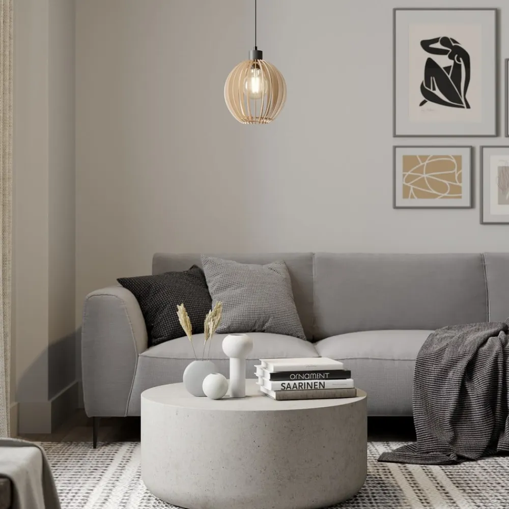 Hængelampen Clay er fastgjort til en metalbaldakin med et sort tekstilkabel. Lampens skærm ligner en kugle og består af enkelte birketræselementer. Disse er placeret med afstand imellem hinanden og giver lampen et åbent udseende. Man kan se pæren indeni. Derfor er dekorative lyskilder særligt velegnede til belysning. Derudover skabes de smukke lys- og skyggeeffekter.