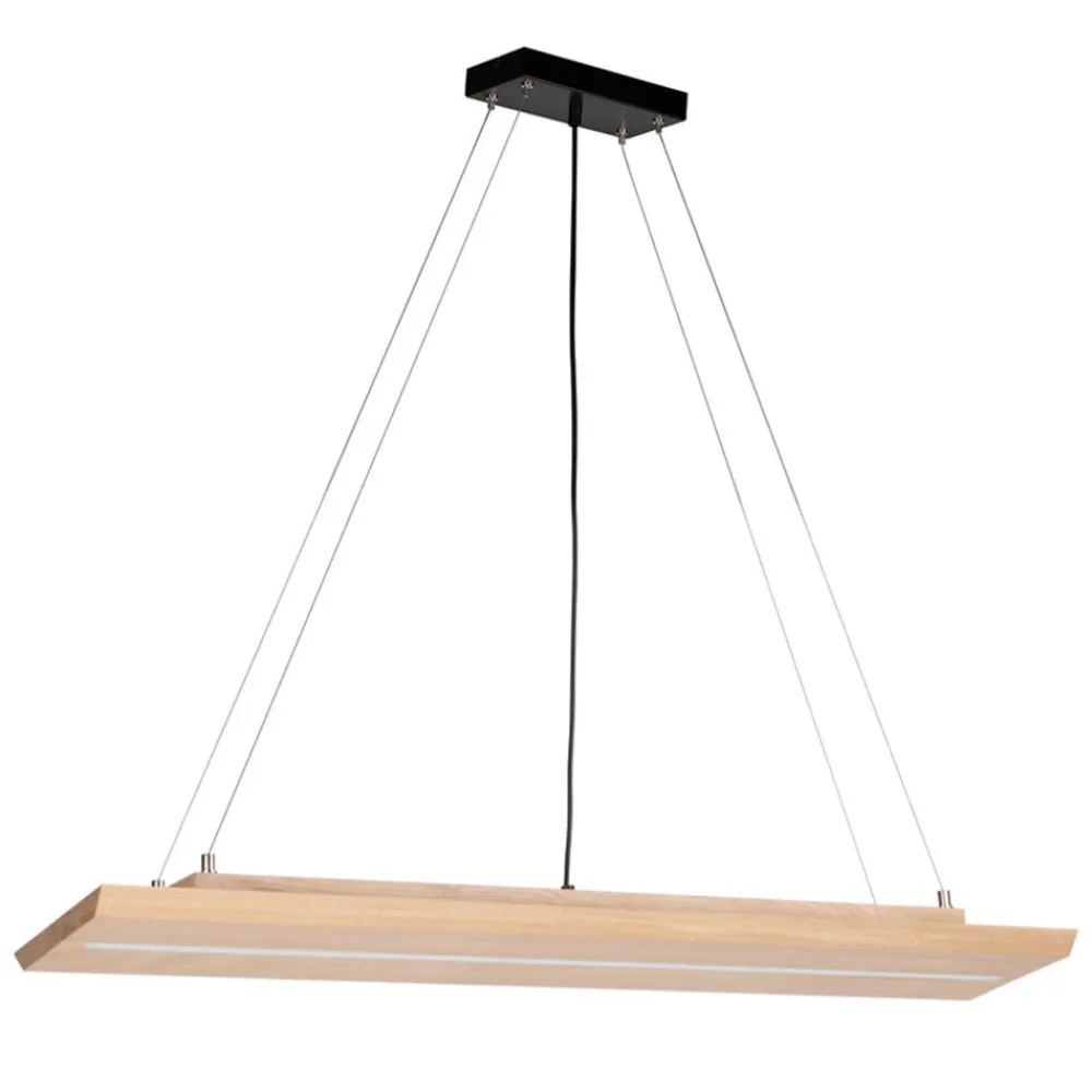 Moderne LED-pendel Tribe af lyst bøgetræ Tribe LED-pendlen har et naturligt, varmt og lyst udseende med sin krop af olieret bøgetræ. Den er udstyret med en strimmel med integrerede LED’er på undersiden, som giver direkte, varm hvid belysning til området nedenunder. Fire tynde kabler bruges til at fastgøre den til den sorte metal baldakin. Ligesom kroppen har baldakinen et rektangulært design, så Tribe kan integreres ideelt i moderne møbleringskoncepter – Envostar brand armatur – Fremstillet i Europa – Bæredygtig emballage lavet af genanvendelige materialer