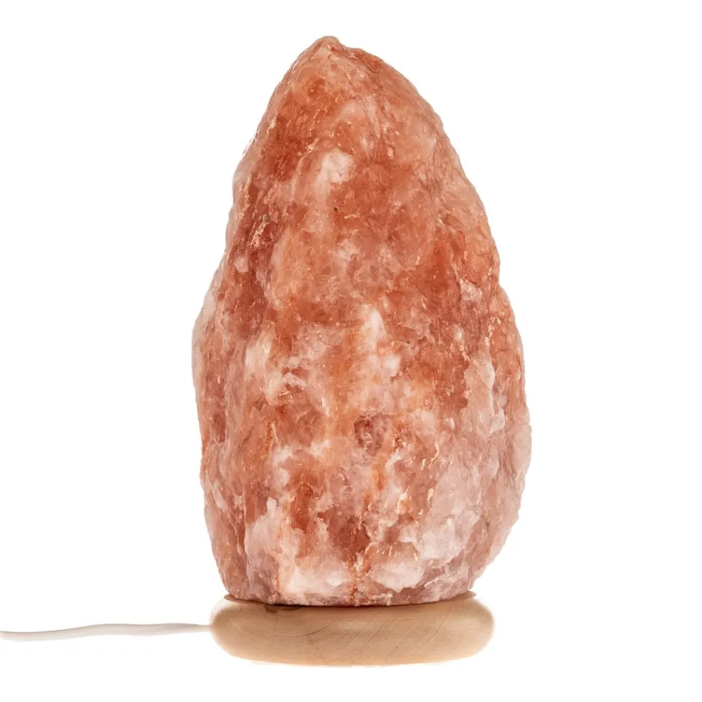 Harmony bordlampe af rustik, naturlig saltkrystal med lys træfod Den typiske, behageligt varme lysstemning fra en saltlampe forstærkes yderligere af den runde fod af lyst træ. Den rødlige saltsten lader lyset fra pæren, som kan bruges indeni, skinne blidt igennem. Saltkrystallen er brudt fra en større blok og efterladt i sin naturlige tilstand, så hvert eksemplar har individuelle farve- og formnuancer, og størrelsen kan variere lidt – Produceret i Europa; håndterbare transportruter og reduceret CO2-udledning – FSC®-certificeret træ – plastfri emballage med genbrugsmateriale