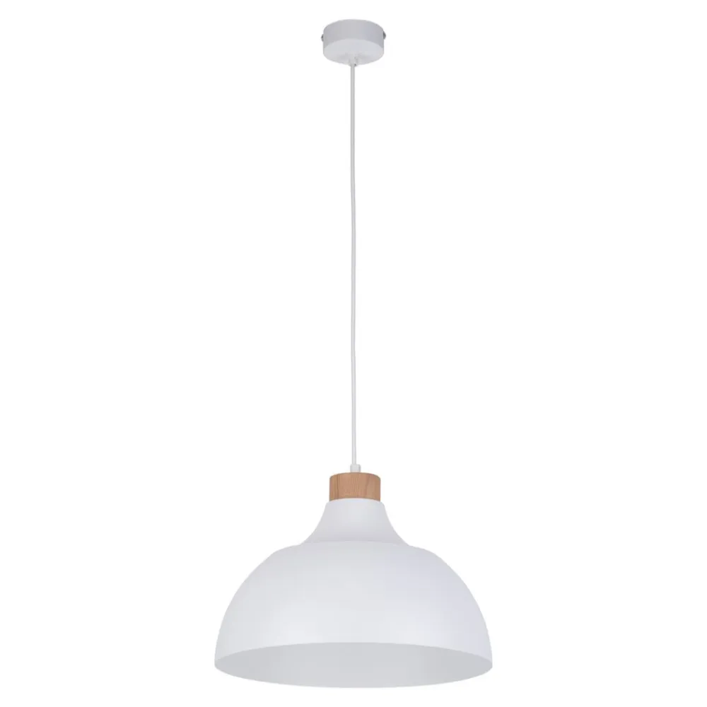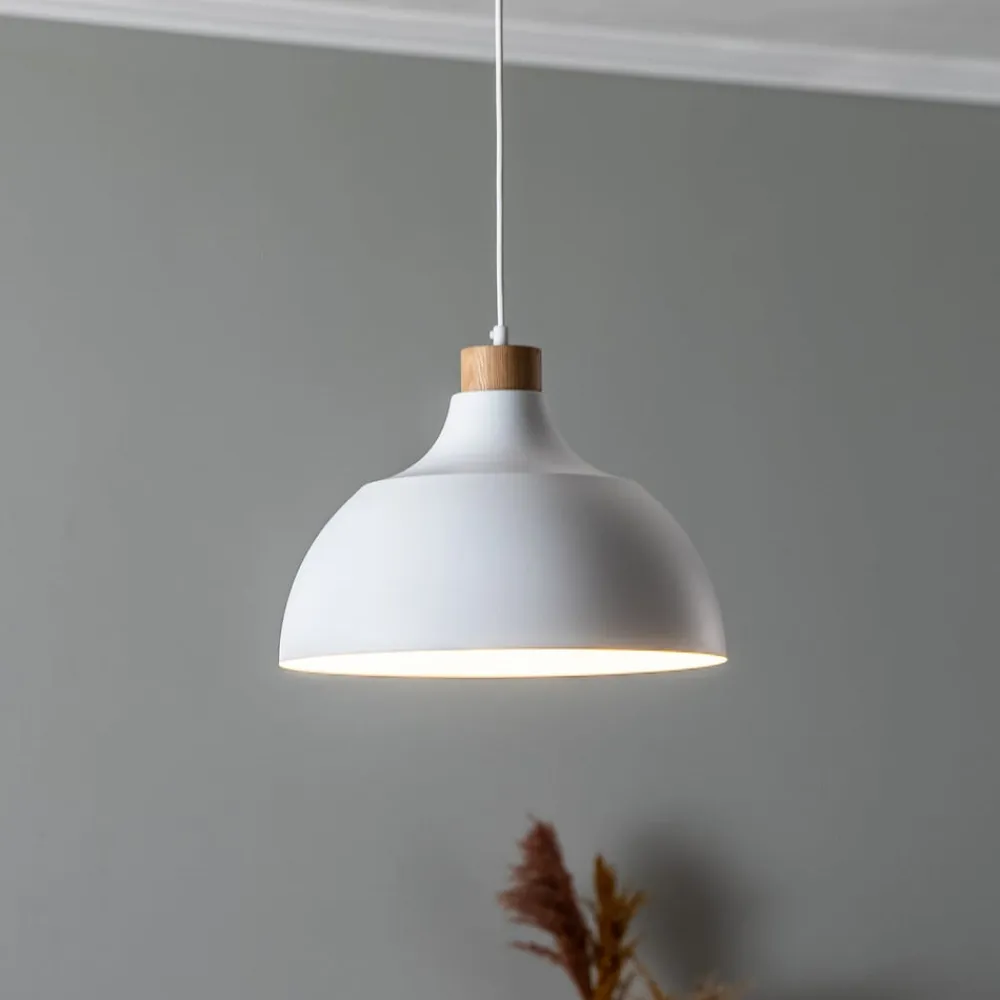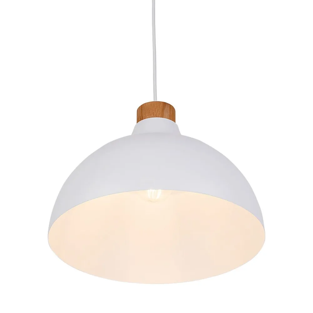 Enkeltflameh pendellampe Kaitt med rund stålskærm i hvid og lyse trædetaljer