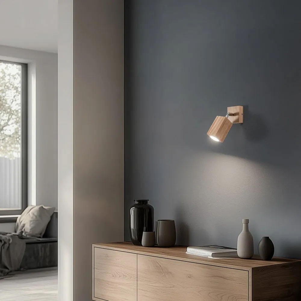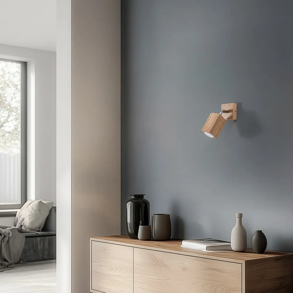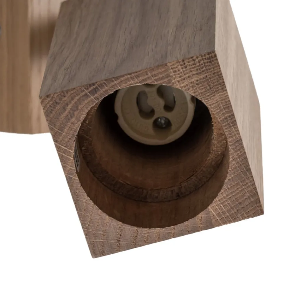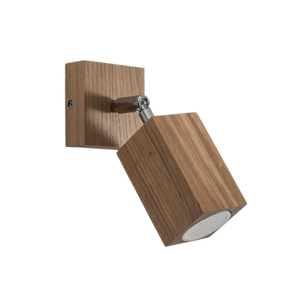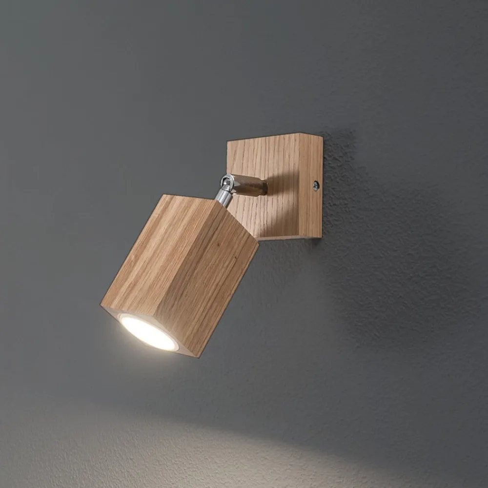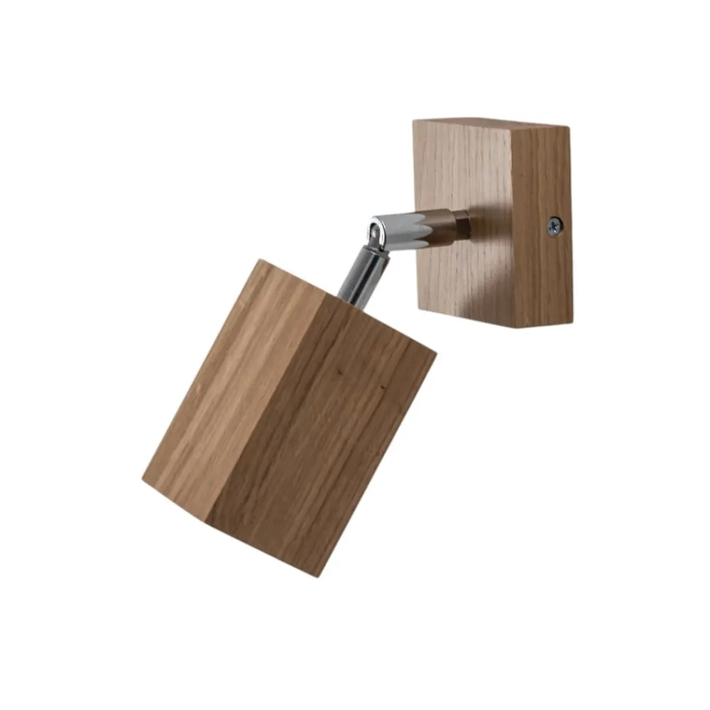 Enkeltflamme-vægspot Peach Puff af lyst træ i kubusform Peach Puff-vægspot af træ, fremstillet i Europa, er en fleksibelt justerbar lyskilde med en naturlig udstråling til tørre indendørs områder. Det kubusformede hoved har en rund åbning foran, som passer til en lyskilde med en diameter på 5 cm og en længde på 5,6 cm.