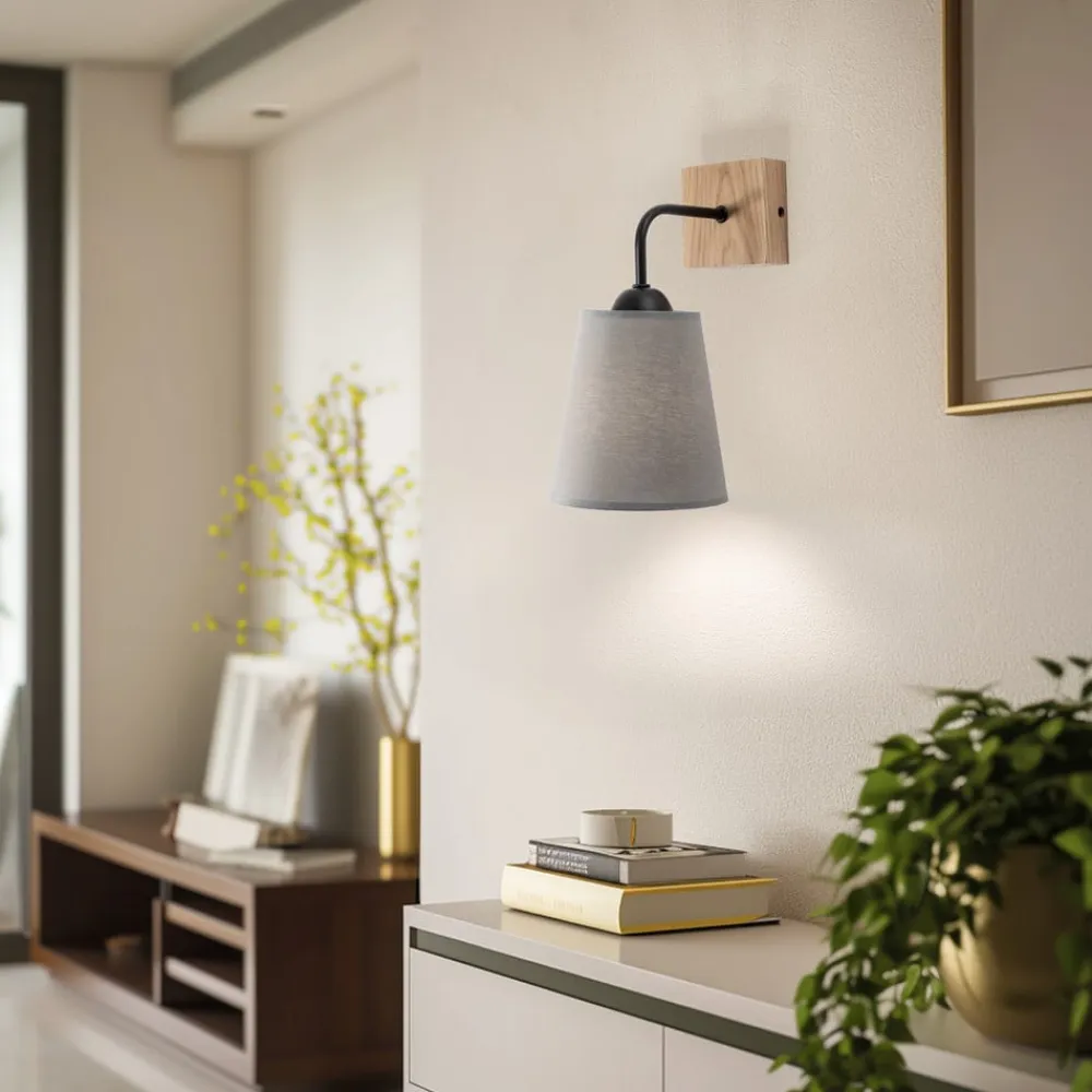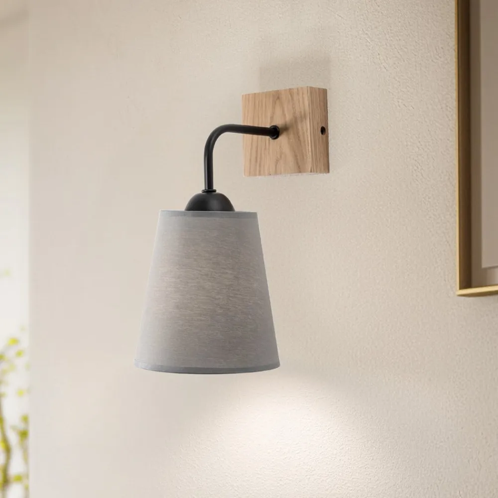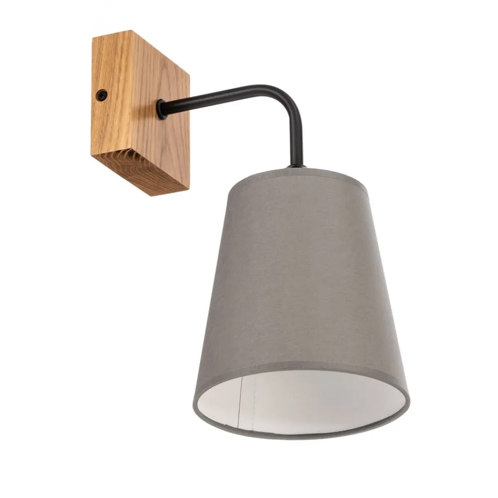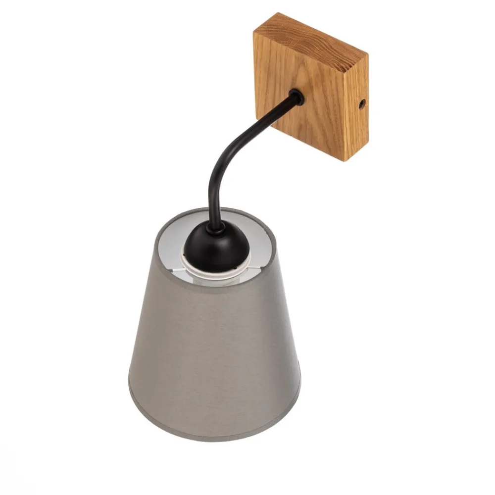 Risco væglampe med nedadvendt stofskærm i grå Designet af Risco væglampe med én lampe, kvadratisk vægbeslag og keglestubformet skærm er absolut tidløst. Skærmens grå stof og vægpladens egetræ, der er forbundet med et kort beslag af sortlakeret stål, skaber en alsidig lyskilde med en hyggelig og naturlig karakter.