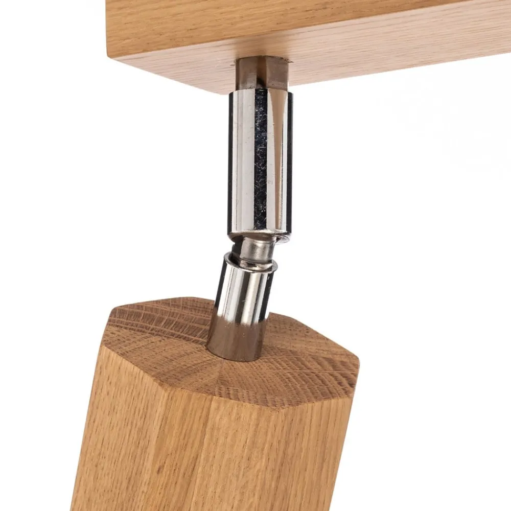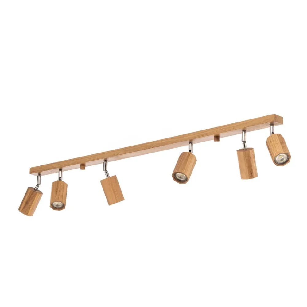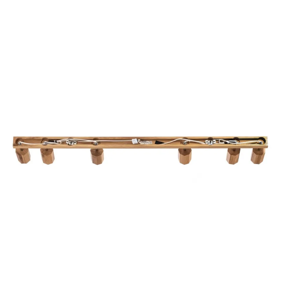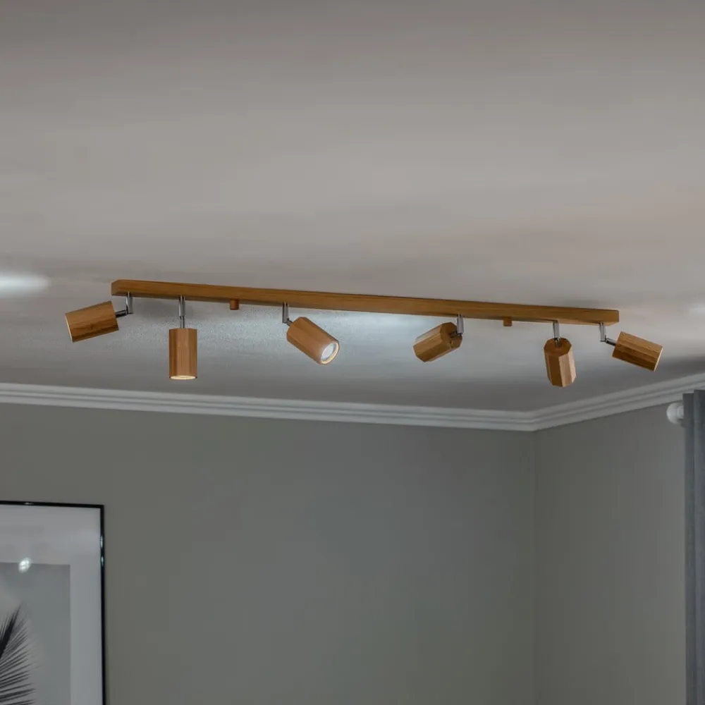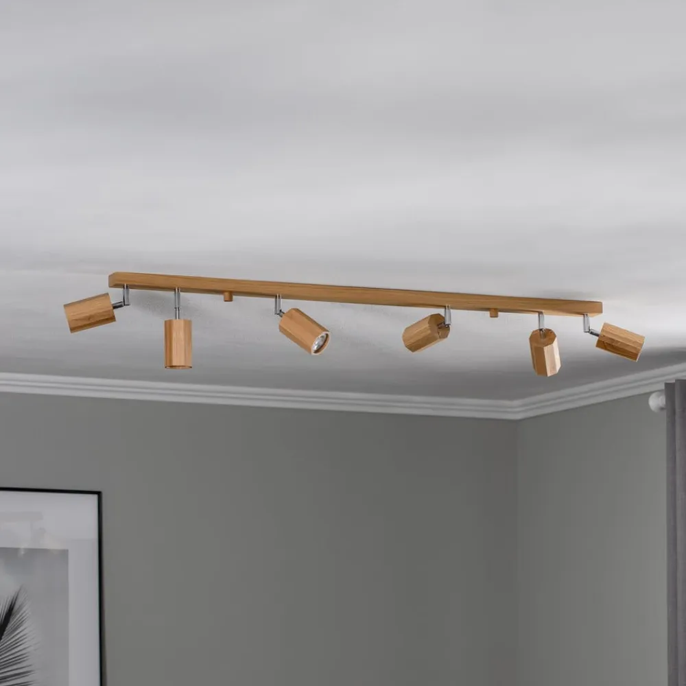 Peach Puff loftsspot med seks lys i lyst træ og ottekantet form Peach Puff loftsspot i træ, fremstillet i Europa, er en fleksibelt justerbar lyskilde med en naturlig udstråling til tørre indendørs områder. De seks aflange hoveder med en ottekantet base er placeret under en rektangulær baldakin og har hver en rund åbning på undersiden, som passer til en 5 cm Ø, 5,6 cm lang lyskilde.