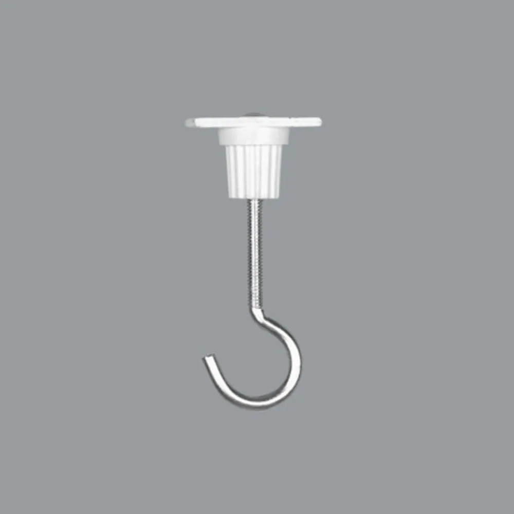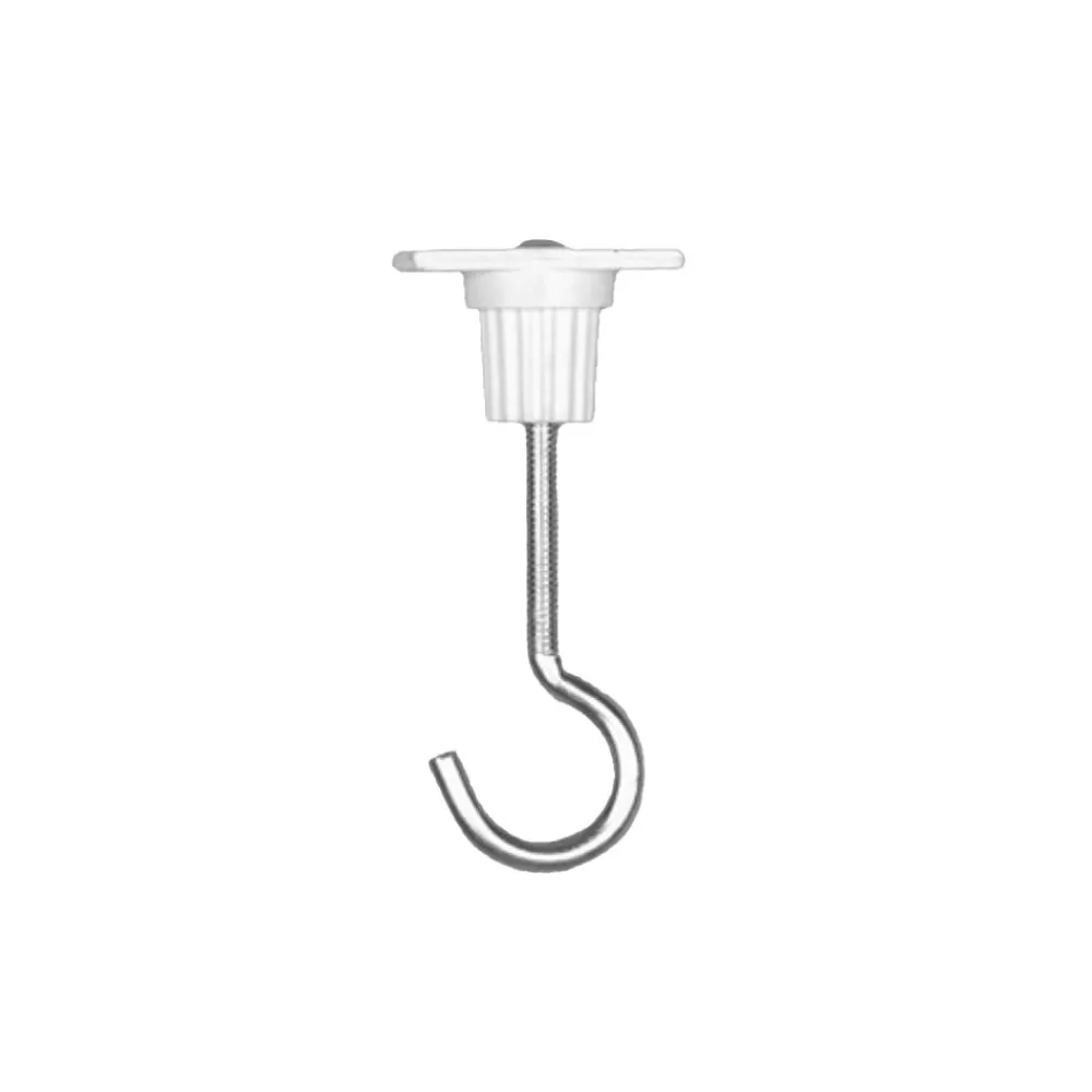Denne dekorative krog af stål med en hvid plastskinneholder kan sættes ind i en ERCO højspændingslederskinne for at hænge bannere, dekorative genstande osv. på krogen.