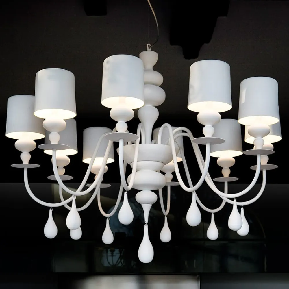 Lysekronen EVA er et enestående stilmiks, der både er en hyldest til den gammeldags lysekrone og fremstår som et nyt, fuldkommen moderne design. Lysekronen er udstyret med i alt 10 smukt udformede lampeskærme i aluminium. Når lyset reflekteres fra skærmenes hvide inderside, tager det sig usædvanlig fordelagtigt ud og bidrager til en harmonisk og stemningsfuldt elegant atmosfære. Endnu en ejendommelighed ved denne lampe er dens arme og de hængende pynteelementer, som alle er skabt af en smukt drejet træstruktur.