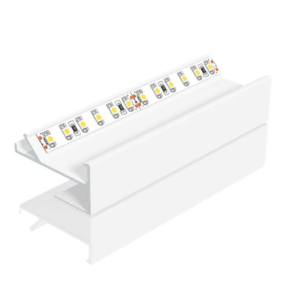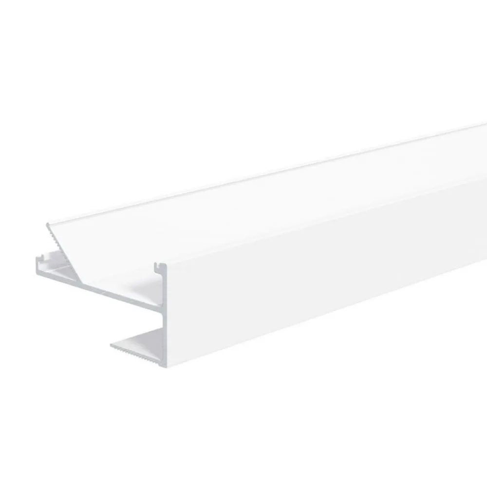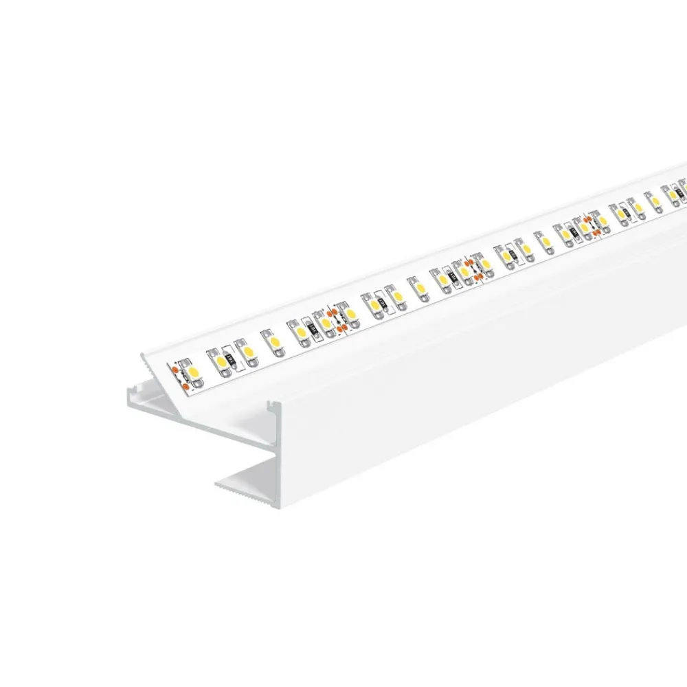 Gipsvægsprofil APTBH af aluminium til lysbue, loftsmonteret Aluminiumsprofilen APTBH bruges til indirekte belysning via loftet på lysbuer. Den er velegnet til gipsplader med en tykkelse på 12,5 mm og LED-strips med en bredde på op til 18 mm og maks. 30 W pr. meter. Når installationen er færdig, er LED-strimlen ikke længere synlig fra rummet. Profilens underkant er nivelleret over et stort område med gipspladen og stofindsatsen og giver et særligt godt greb takket være den rillede overflade. Fronten kan males, så den passer til væg/loft/panel og visuelt fordobler den synlige overflade.