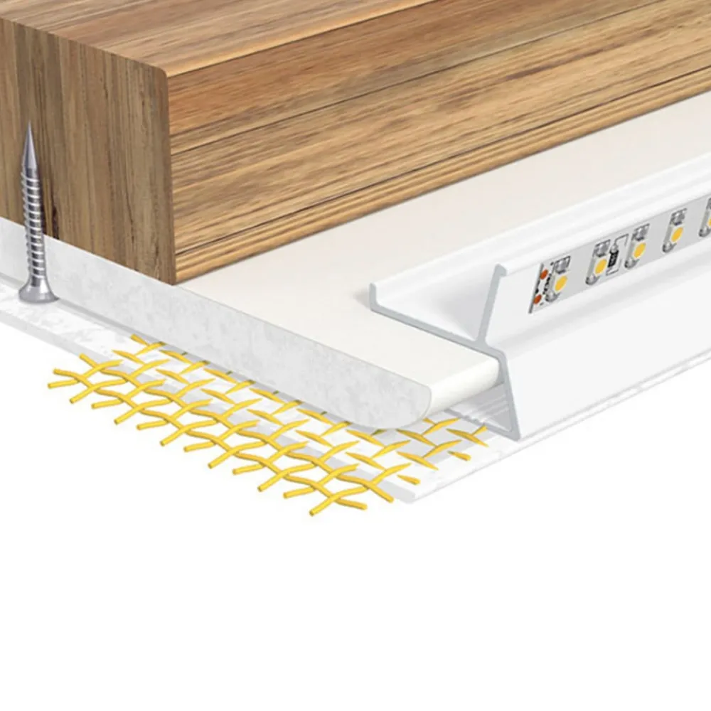 Gipsvægsprofil APTBU af aluminium til lysbue, vægmonteret Aluminiumsprofilen APTBU muliggør indirekte belysning via væggen. Den er velegnet til gipsplader med en tykkelse på 12,5 mm og LED-strips op til 12 mm brede og maks. 30 W pr. meter. Når LED-strimlen er installeret, er den ikke længere synlig fra rummet. Den nederste kant af profilen er fyldt ud over et stort område med gipspladen og stofindsatsen. Mellemrummet mellem gipspladen og loftet bør være maks. 8 cm. Profilens kant kan males i samme farve som den omgivende væg/loft/panel. Lysets effektive frie udstrålingsvinkel er 120°; jo større afstanden til væggen er (anbefaling: 6 til 15 cm), jo højere er den oplyste del af væggen.