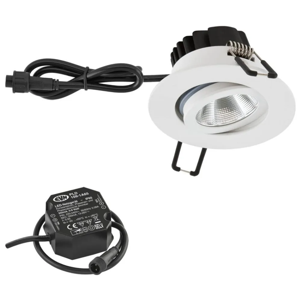 PC65 drejelig LED-indbygningslampe til udendørs brug med strømforsyning PC65 LED-indbygningslampen er fremstillet af pulverlakeret aluminium og har et hus af høj kvalitet. En rude af gennemsigtigt glas fungerer som afdækning. Det sobre design af denne indbyggede udendørslampe sikrer, at den passer diskret ind i loftet og kan bruges i fugtige rum og udendørs områder uden problemer takket være IP65-beskyttelsesgraden (beskyttelse mod vandstråler og støvtæt). LED-indbygningslampen PC65 udsender med sin kraftige LED-chip et varmt hvidt lys og oplyser indgangspartiet, passager i gården og terrasser eller kan bruges som spotlight til målrettet effektbelysning – egnet til møbelkonstruktion (brandbeskyttelsesmærke MM) – længde på forsyningskabel 30 cm (IP65-stik) – COB LED – inkl. LED-strømforsyningsenhed (længde på tilslutningskabel 15 cm) – dæmpbar via forkant- og bagkantfasedæmper