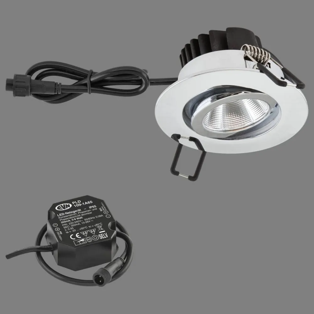 PC65 drejelig LED-indbygningslampe til udendørs brug med strømforsyning PC65 LED-indbygningslampen er fremstillet af pulverlakeret aluminium og har et hus af høj kvalitet. En rude af gennemsigtigt glas fungerer som afdækning. Det sobre design af denne indbyggede udendørslampe sikrer, at den passer diskret ind i loftet og kan bruges i fugtige rum og udendørs områder uden problemer takket være IP65-beskyttelsesgraden (beskyttelse mod vandstråler og støvtæt). LED-indbygningslampen PC65 udsender med sin kraftige LED-chip et varmt hvidt lys og oplyser indgangspartiet, passager i gården og terrasser eller kan bruges som spotlight til målrettet effektbelysning – egnet til møbelkonstruktion (brandbeskyttelsesmærke MM) – længde på forsyningskabel 30 cm (IP65-stik) – COB LED – inkl. LED-strømforsyningsenhed (længde på tilslutningskabel 15 cm) – dæmpbar via forkant- og bagkantfasedæmper