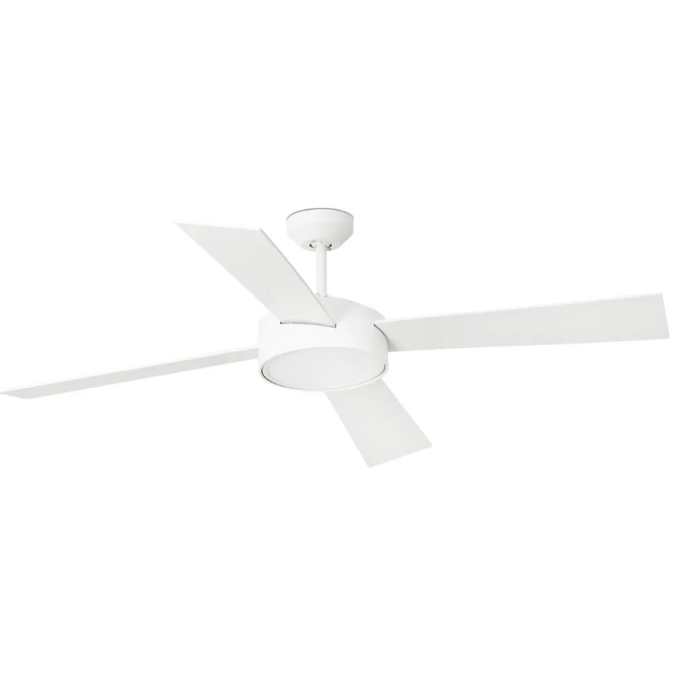Loftventilatoren Hydra med fire vinger fremstillet af fiberplader med middelhøj densitet og et hus med en stålmonteringsstang er helt hvid. Den har en LED-lampe, hvis varmt hvide lys sendes nedad gennem et satineret, rundt plastikdæksel.