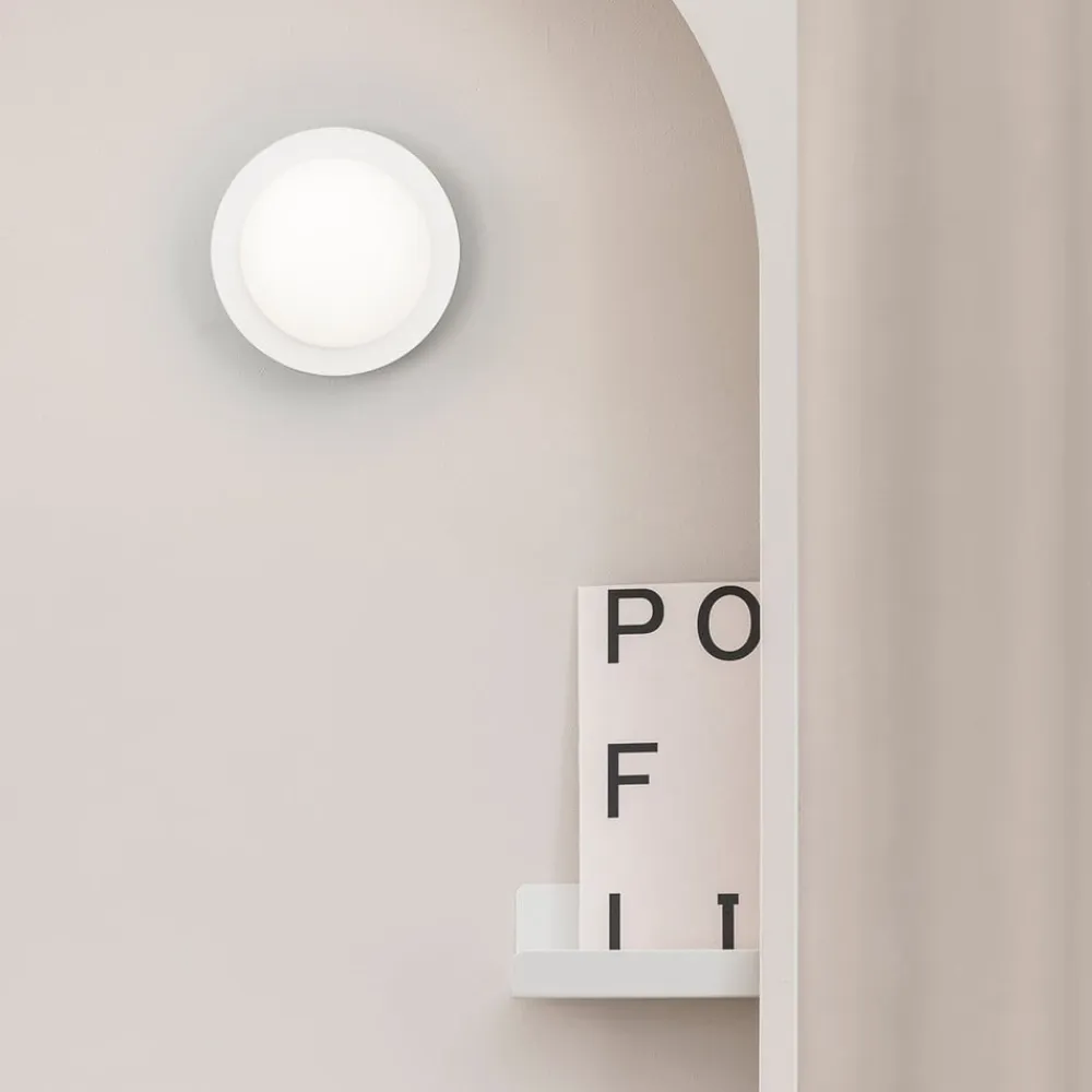 LED-væglampen May har en opalhvid glasskærm i den berømte LED-væglampe May, der sidder på den berømte præsentationsplade. Den understøttes af et robust vægbeslag af stål. May har en IP44-beskyttelsesklasse og er således beskyttet mod stænkvand.