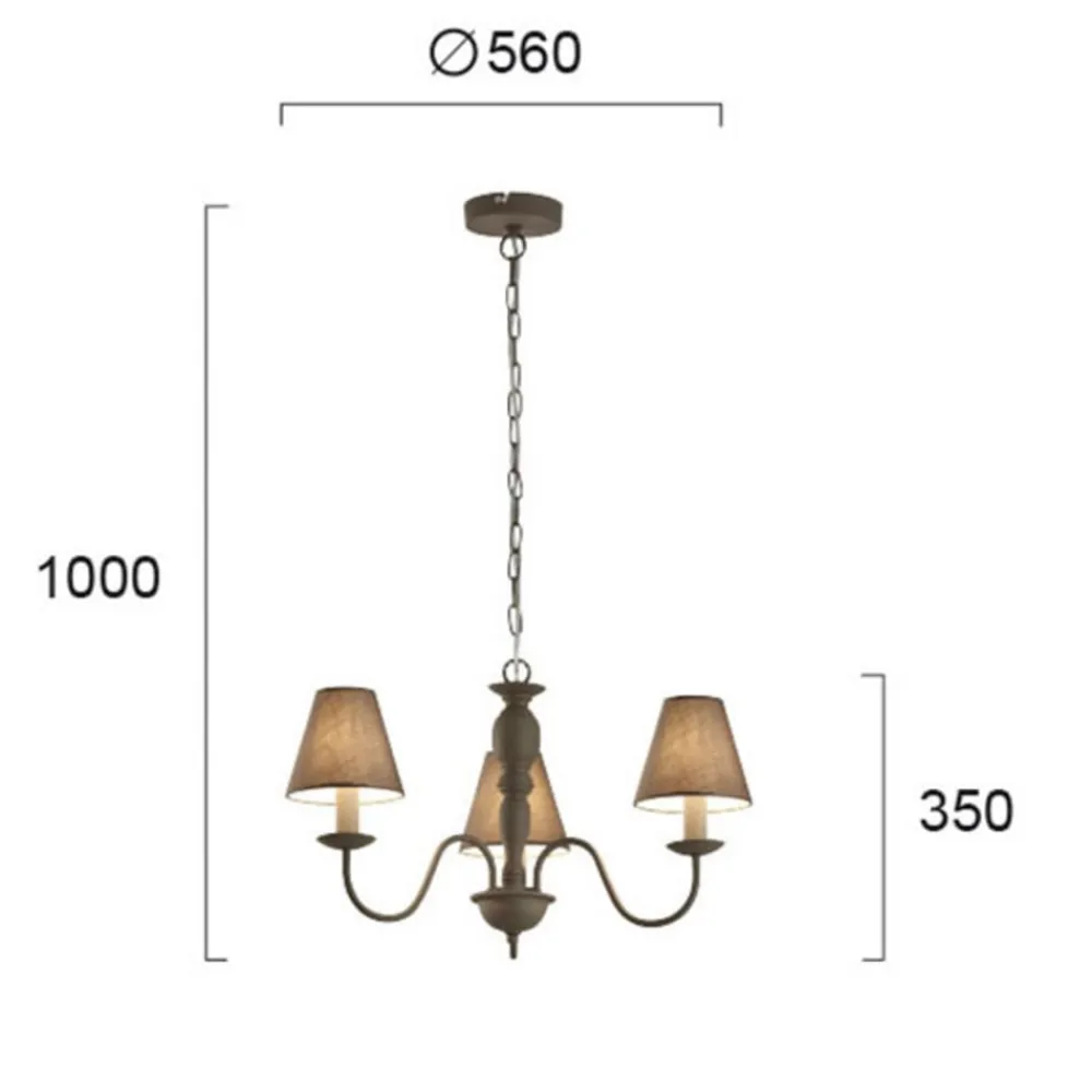 Fatima lysekrone har en buet stel, der minder om bølgespor. Grundmalingen på stålelementerne er grå, ligesom paraplyernes stof. Det er ideelt som spisebordsbelysning med de tre stofskygger vendt opad, og lyset oversvømmer derfor rummet meget behageligt og bidrager således til større komfort. For at belyse bordet på en energibesparende måde kan moderne LED-lamper bruges i E14-stikkene udover glødelamper op til 40 W.