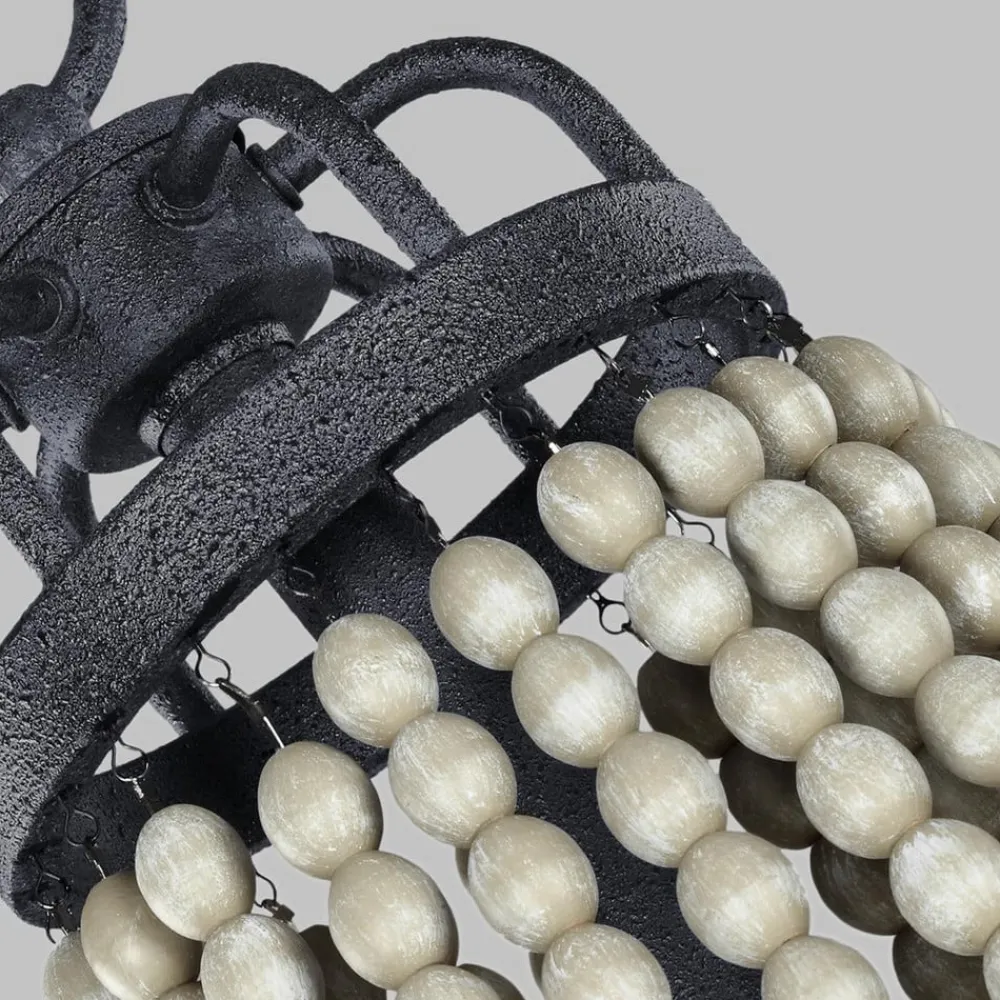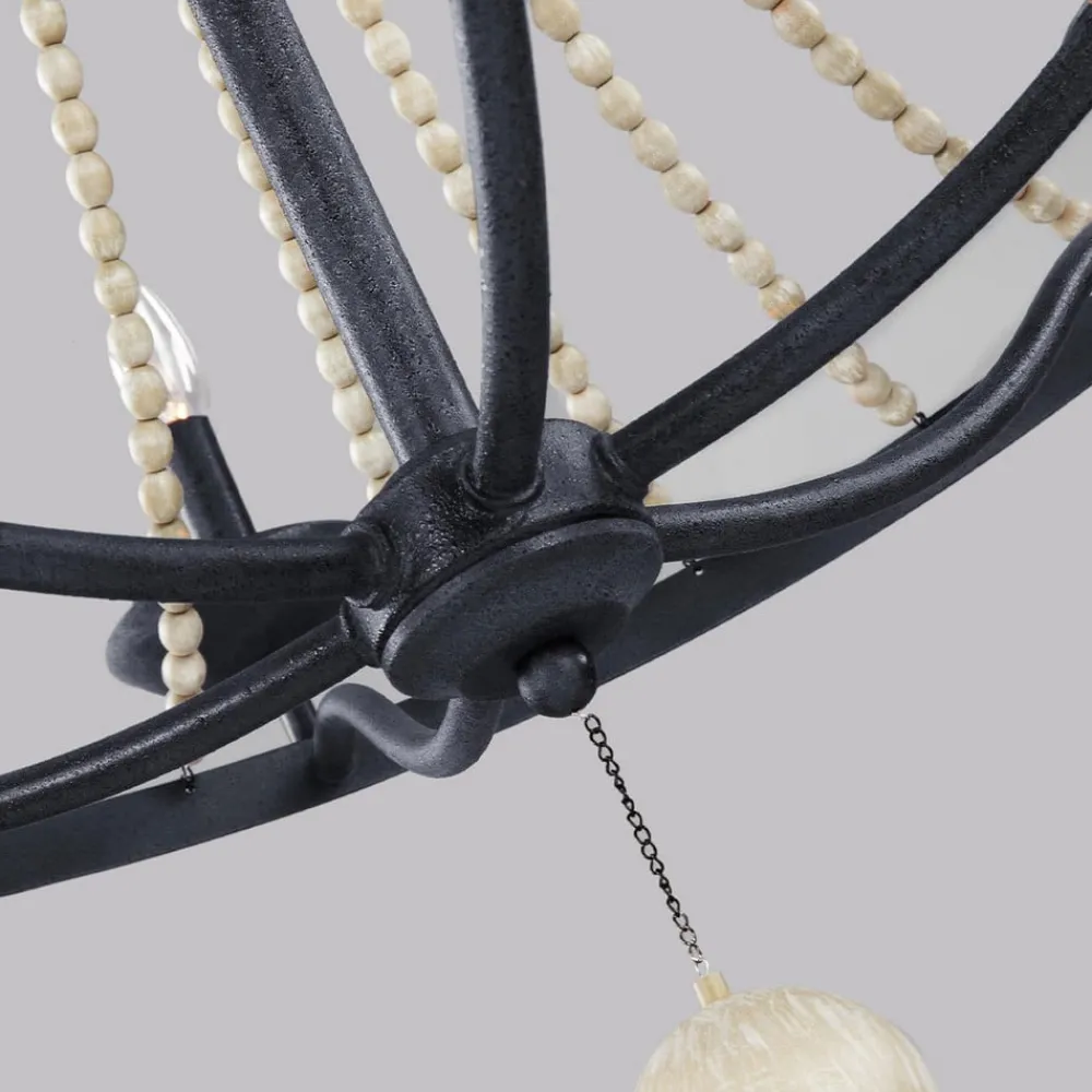 Nori-lysekrone med seks lys og drivtømmerperler Denne lysekrone bliver et absolut blikfang ethvert sted. Stellet med den mørke, forvitrede zinkfinish samt den frodige udsmykning af drivtømmerperlekæder skaber et absolut blikfang. Alle pærer med en E14-sokkel passer i de seks fatninger (medfølger ikke). Filamentlys, som kan bestilles separat via tilbehøret, har den mest dekorative effekt. Et andet blikfang er drivtømmerkuglen, der hænger i den nederste ende