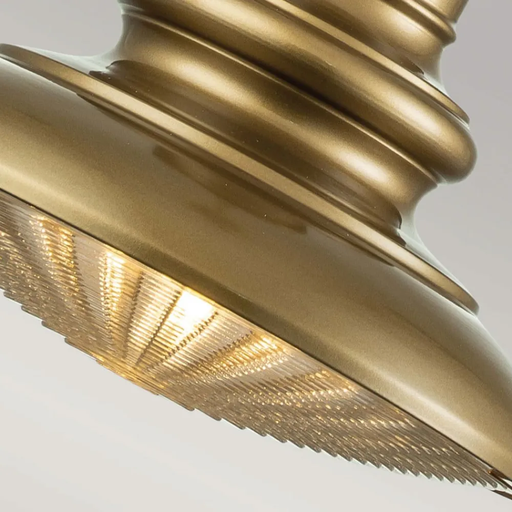 Messingfarvet Redding Station udendørs pendel Lavet af aluminium med en antik messingfarvet finish og glas, Redding Station pendel er en dekorativ lyskilde til mange udendørs områder. En diffusor af prismatisk glas sidder i den brede, flade lampeskærm og giver en effektiv spredning af lyset.