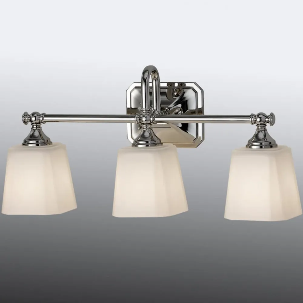 De tre-lampe Concord badeværelse spejllampe lys fanger øjet med sin koloniale-inspireret design. Det udsender atmosfærisk lys, som har en speciel effekt på grund af den svage hældning af skærmkantenes glaskanter. Den svanehalsformede arm, der forbinder til vægbeslaget, er også slående. Med den blanke, polerede kromfinish og de hvide briller kan Concord kombineres meget godt med mange møbler.
