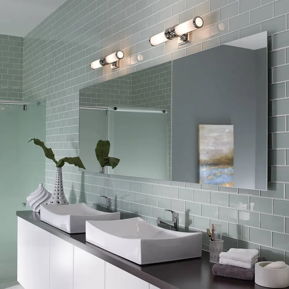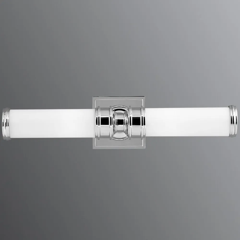 Payne-væglampe – en lyskilde med to lys til badeværelset Payne-væglampens design er en moderne og enkel fortolkning af den klassiske Tudor-stil, hvilket skaber en meget elegant og let effekt. De to lyskroppe er lavet af ætset opalglas, mens det kantede vægbeslag og rammen er lavet af metal med en poleret kromfinish. Placeret på væggen over badeværelsesspejlet giver Payne-væglampen med to lys tilstrækkelig belysning med en meget atmosfærisk karakter. Med beskyttelsesklasse IP44 er den beskyttet mod indtrængen af stænkvand fra alle sider.