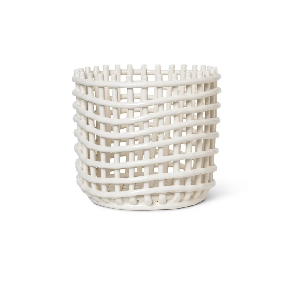 Keramisk kurv fra ferm LIVING lavet af håndlavet, glaseret keramik De håndlavede kurve fra Ceramic-serien fra ferm LIVING fremkalder den velkendte følelse af flettede beholdere og bringer traditionel kurvemageri til keramik. Det multifunktionelle design kan bruges som blomsterkrukke, frugtskål eller som et dekorativt midtpunkt i et rum. De håndformede og kunstfærdigt ujævne kurve er hver især unikke. Produktnote: Denne genstand er håndlavet – der kan forekomme variationer i forhold til produktbilledet. Plejeanvisninger: Tørres af med en fugtig klud.