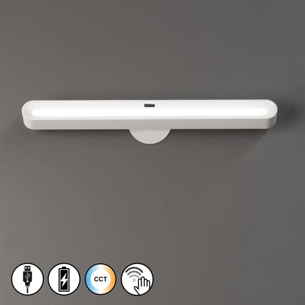 Smal LED-underskabsbelysning Magnetics med genopladeligt batteri, trinløst dæmpbar Denne aflange LED-underskabsbelysning Magnetics har et smalt element og er udført i hvid. Den enkle installation ved hjælp af en magnetisk enhed giver mange fordele, som kan udnyttes fleksibelt takket være batteridriften. Møbellampen kan oplades med det medfølgende USB-ladekabel og kan f.eks. også monteres på billeder eller over spejle. Magnetics er udstyret med en sensorkontakt og gestusstyring, så den kan dæmpes uden besvær og tændes og slukkes helt intuitivt.