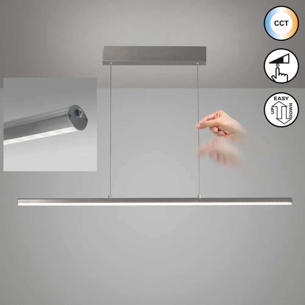 LED-hængelampen Borena kombinerer funktionalitet og stilfuldt design for at give ethvert rum en særlig atmosfære. Hængelampen er fremstillet af metal og er en robust og holdbar løsning til belysning i stuen, spisestuen eller køkkenet. Den integrerede LED-lyskilde giver energibesparende lys, der kan indstilles i forskellige farvetemperaturer fra varmhvid til universalhvid ved hjælp af CCT-funktionen.