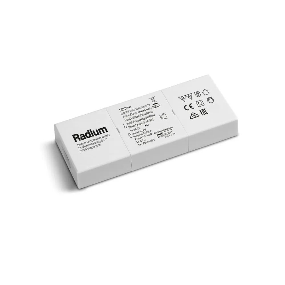 LED-driver Flat fra Radium til LED-strips, 24VDDette LED-kontroludstyr er beregnet som en kompakt konstantspændingsforsyning på 24V til drift af LED-moduler. Flat-serien fra Radium er beregnet til indendørs brug og fungerer som driver til hvide LED-strips.- ikke dæmpbar- til indendørs brug- tilslutningstype: fjederklemmer