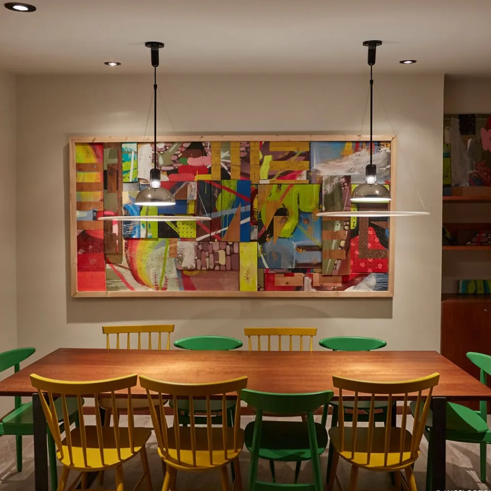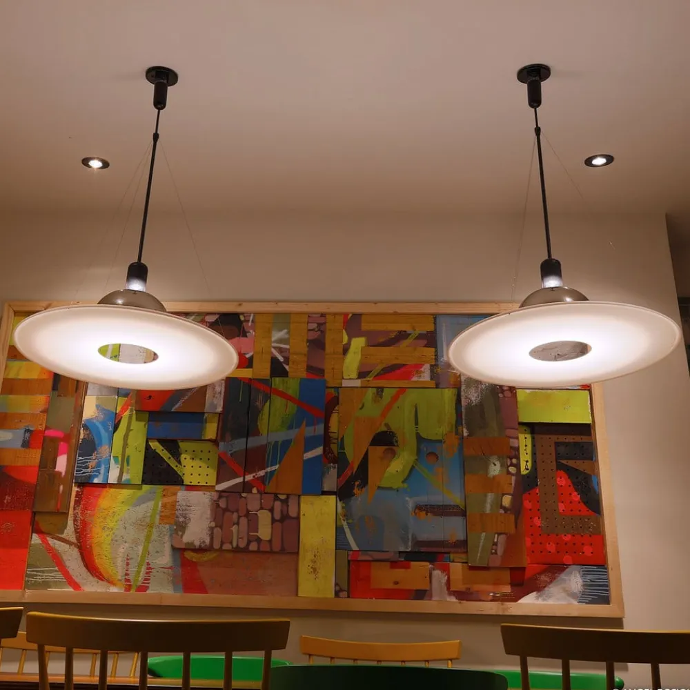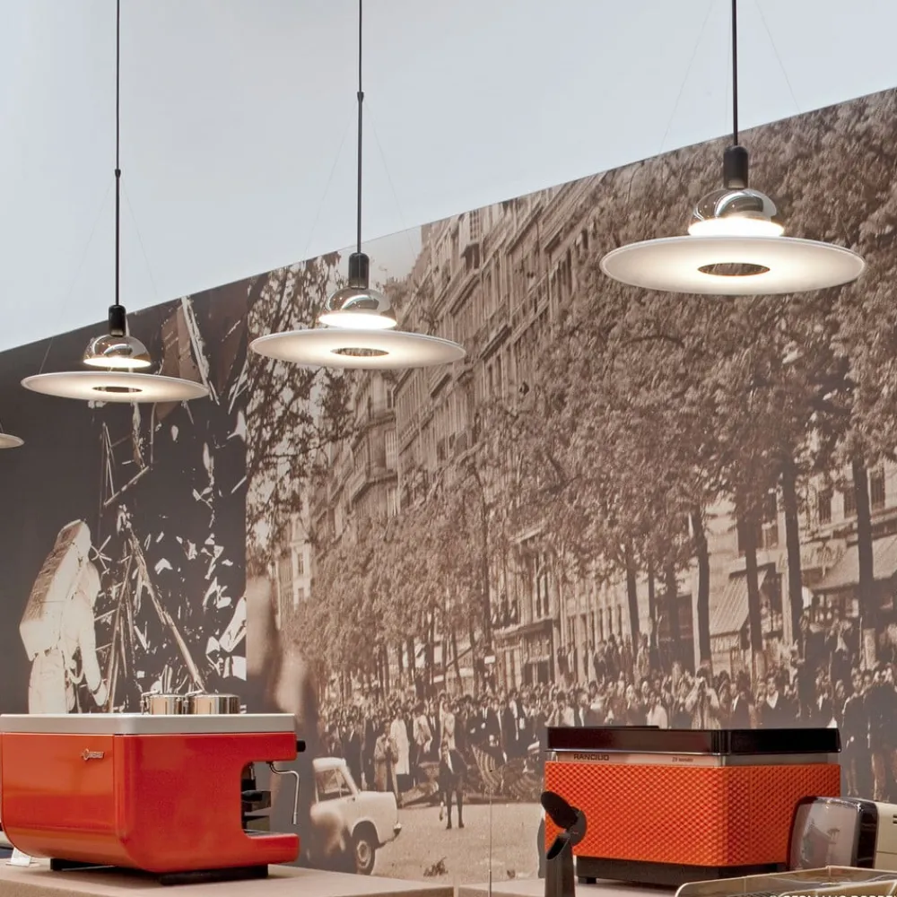 FRISBI fra FLOS – den ideelle hængelampe til spisestuen og køkkenet Selv om det er skrevet lidt anderledes, er det let at forestille sig, at navnet FRISBI til denne hængelampe er inspireret af det velkendte kastespil, da PMMA-disken hænger i knap synlige stålwirer og derfor ser ud til at flyve lidt i luften – ligesom frisbee’en. Ved at bruge en relativt lysstærk pære eller en passende sparepære kan FLOS hængelampen placeres ideelt over et spisebord. FLOS har nu eksisteret i over 50 år og har sammen med et team af anerkendte designere skabt særlige lamper af høj kvalitet, som har fået stor international anerkendelse og mange priser.
