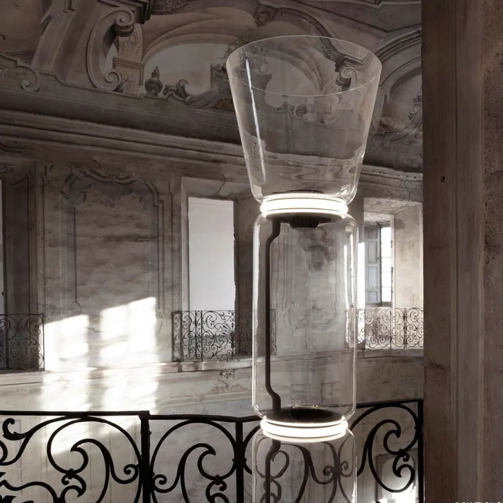 Noctambule er en mesterlig belysningsserie af designeren Konstantin Grcic, som kombinerer unikke armaturer med den nyeste LED-teknologi i samarbejde med den italienske producent Flos. Gulvlampen Noctambule består af tre cylindriske glaselementer og et kegleformet element, som er fremstillet af mundblæst glas. De enkelte glasblokke er afbrudt af ringformede silikonediffusorer, hvorunder LED’erne er placeret. Lyssøjlen holdes af en stor, rund sokkel af støbt aluminium.