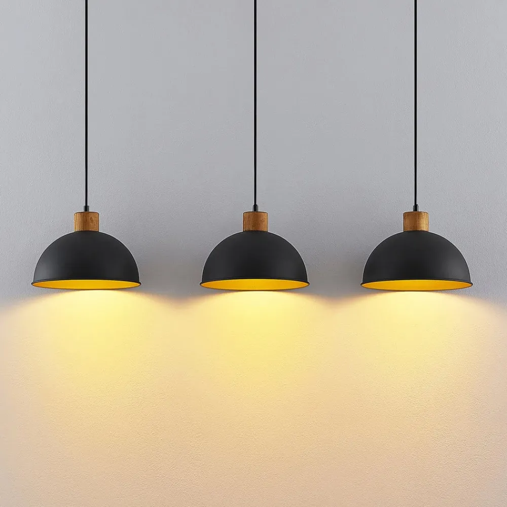 Flurin 3 lyskilder hængelampe i et robust design af jern og gummitræ Flurin hængelampen kombinerer en robust karakter med en hyggelig farvekombination. Lampeskærmene er lavet af jern og har et sandsort ydre, mens deres indre vægge fremstår i en slående guldfarve. Der er plads til en E27-pære inde i hver skærm, som giver den nødvendige belysning. Lyset dæmpes smukt gennem åbningen på undersiden, hvilket gør den perfekt til at oplyse et langt spisebord. Den passer godt ind i mange forskellige indretningsstile og gør ethvert rum til noget helt særligt.