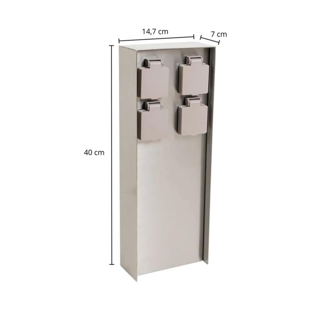 Den moderne stikdåse Foranda i sølvfarvet stål er et praktisk tilbehør til gården og haven, hvor den pålideligt leverer 4 strømkilder til tilslutning af stik. Det er ligegyldigt, om de bruges til have- og arbejdsredskaber, eller om man bruger dekorative eller midlertidige lyskilder til udendørs brug, f.eks. en spotlight til at belyse bestemte objekter eller smuk sæsonbelysning, der enten spreder sin stemningsfulde charme omkring jul eller understreger sommeren med smukke lys.