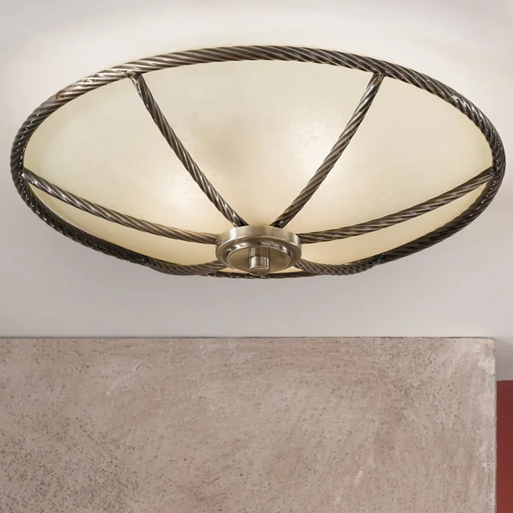 Smuk belysning i klassisk stil: Galina-loftslampen overbeviser med cremefarvet glas og metalelementer i gammel messingDen, der leder efter den rigtige belysning til en klassisk indrettet stue, vil helt sikkert kunne lide Galina-loftslampen. Lyset her skinner i en særlig varm tone, fordi den matte glasskærm ikke bare er hvid, men i en tiltalende cremefarvet nuance. En anden bemærkelsesværdig detalje er metalrammen og metalkanterne, fordi overfladestrukturen her ikke er glat, som man kunne forvente, men imiterer strukturen i et snoet reb.