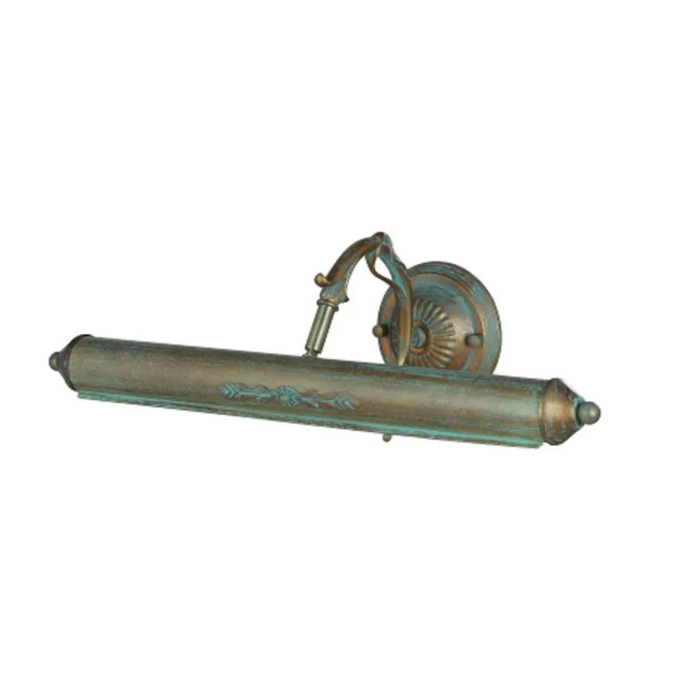 Aflang Kalea gallerilampe med interessante detaljer på metalskærmen Kalea er udstyret med to E14-lamper og kan derfor give god belysning af billedet. Det kan være et maleri eller en tegning, men det kan lige så godt være et kunsttryk eller et fotografi. Fordi overfladen med verdigris-looket ser så nostalgisk ud, og indretningen også er ret antik, kan gallerilampen primært kombineres med klassiske boligstile, som så beriges med en stilfuld lyskilde.