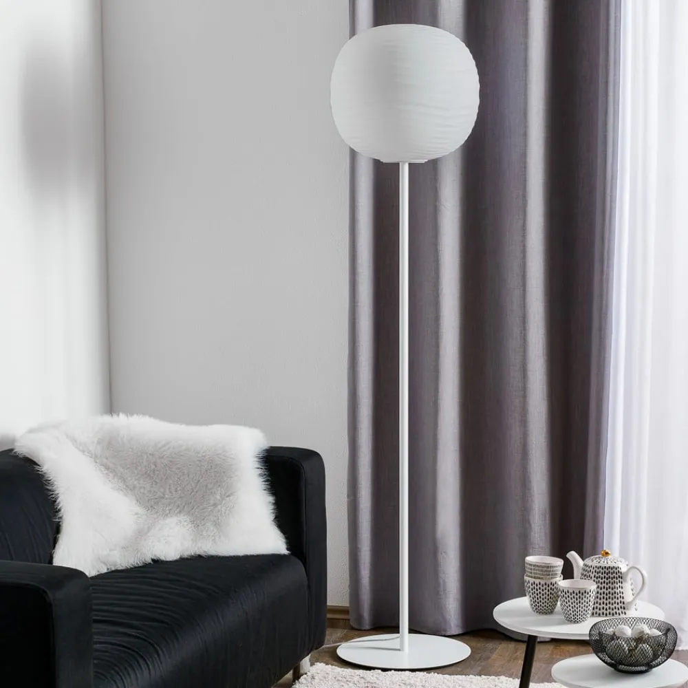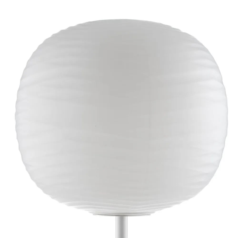 Så snart lydbølger rammer vand eller andre væsker, dannes blide bølger og flydende geometriske mønstre på overfladen. Det er netop dette fænomen, der tjente designerne Ludovica og Roberto Palomba som en kilde til inspiration, når de designer Gem-serien af lamper, som også inkluderer denne standerlampe . Bølgerne findes på overfladen af den runde skygge, som er lavet af håndblæst glas. De flydende, krydsende linjer skaber tredimensionelle facetter, der i kombination med lys sætter atmosfæriske accenter. Lampen er helt omsluttet af det hvide glas, der giver et blødt og blændfrit lys. Metalbasen med sit reducerede udseende understreger standerlampe minimalistiske og samtidig kreative design.