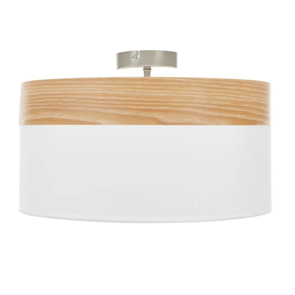 Med en tidløs elegance imponerer loftlampen Libba med afstand: Loftsbeslaget er holdt i mat nikkel, og den store skærm imponerer både visuelt og med dens materialer. Den består af to tredjedele cremefarvet stof, og en tredjedel af plastfiner i en lys træoptik. Takket være bredden på skærmen, opnår man en bred belysning i omgivelserne.