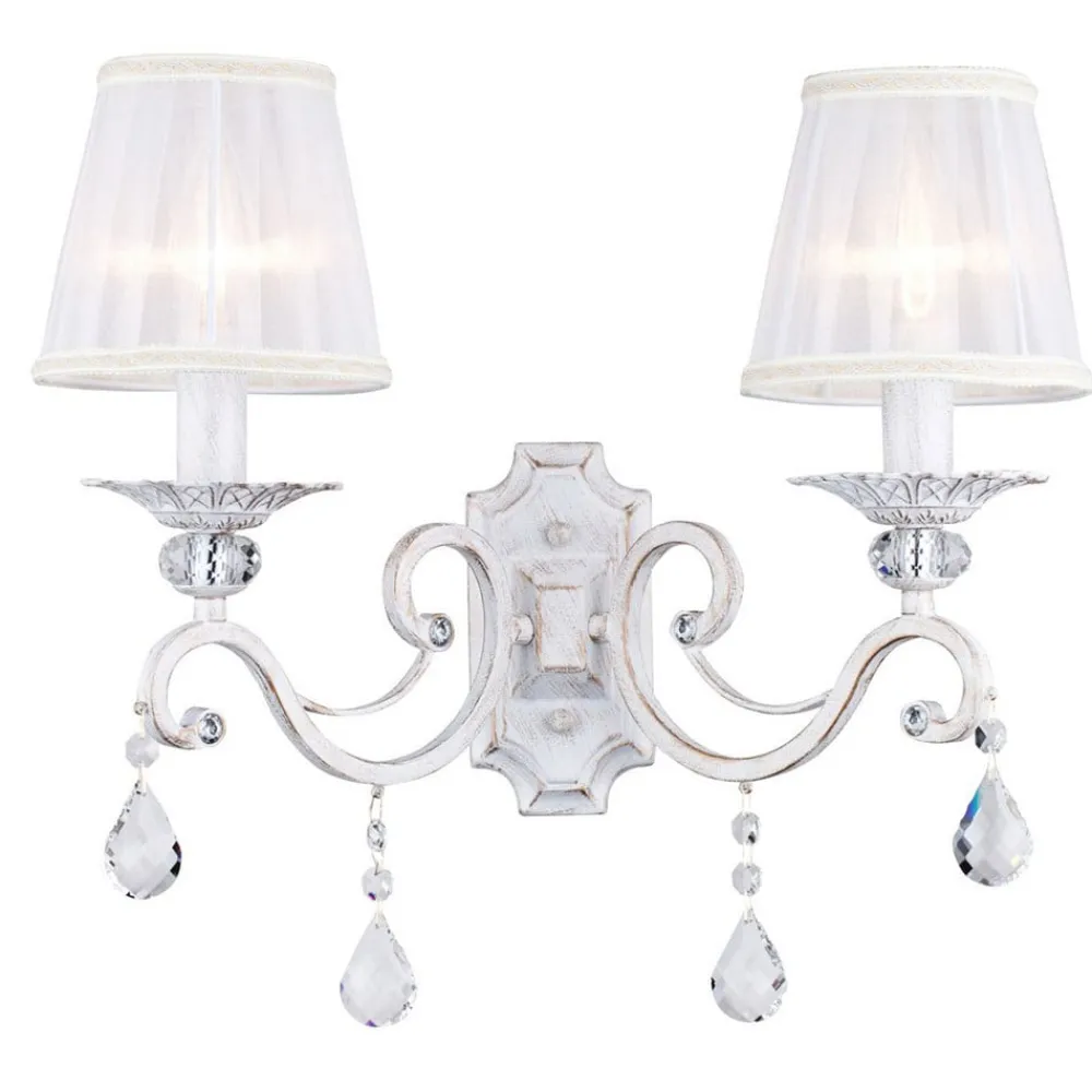 Med krystalpendel – 2 lyskilder Grace væglampe Stilfuld og legende på samme tid: Grace væglampen kombinerer et vintage touch med let elegance. Dens to lampeskærme er lavet af let gennemsigtig, hvid organza, som skaber en særlig glød. Disse to skærme troner på væglampens metalramme, som har et meget udsmykket, dekorativt og shabby-agtigt look. Det shabby look er dygtigt kombineret med krystallernes glitren, som er indarbejdet som komponenter og integreret som ophæng på lampen. Grace væglampen er en særlig lampe, der er et dekorativt blikfang og en ekstra lyskilde. Uanset om det er i stuen, spisestuen eller gangen, kan den 2 lyskilder væglampe bruges på mange forskellige måder.