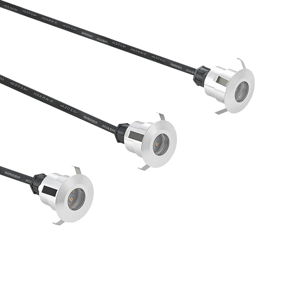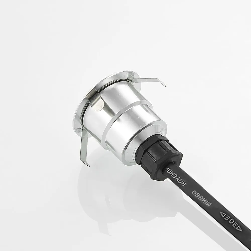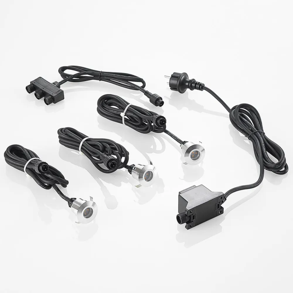 Her leveres tre kompakte forsænkede gulvlamper i et praktisk sæt, der takket være den høje kapslingsklasse er godt beskyttet mod fugt og snavs, så det er muligt uden tøven at bruge udendørs. Armaturhuset består af aluminium i tidløs form og rund form. Lysdiodernes strålevinkel er 60 grader.