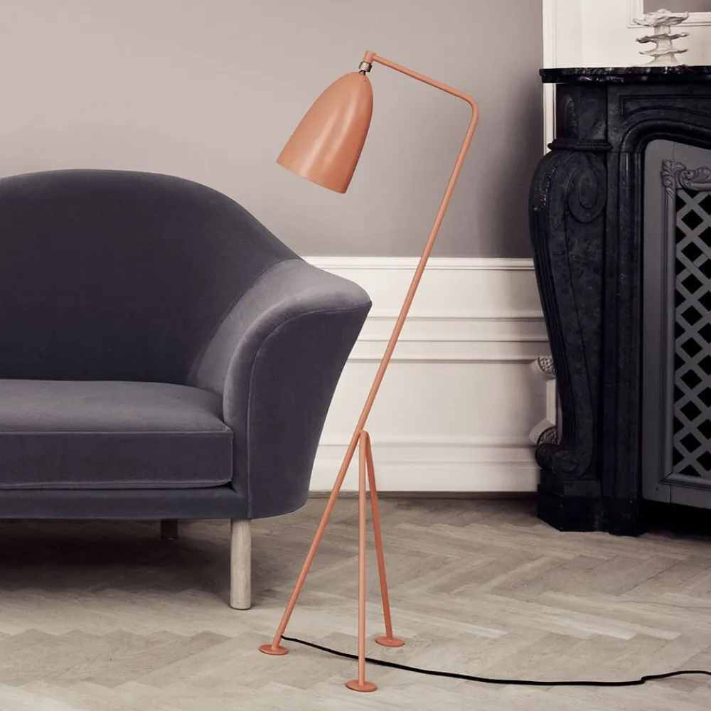 standerlampe Gräshoppa har et livligt præg takket være den trebenede ramme, der er vippet lidt tilbage, hvilket gør den til et trendy møbleringstilbehør til mange boligarealer. Dens lampehoved er konisk i form, og dets retning kan justeres, så lysets retning kan tilpasses individuelle behov. Gräshoppa kan let tændes og slukkes ved hjælp af fodkontakten integreret i forsyningskablet. Designet kommer fra den svenske designpioner Greta Magnusson Grossman og blev introduceret i 1947.