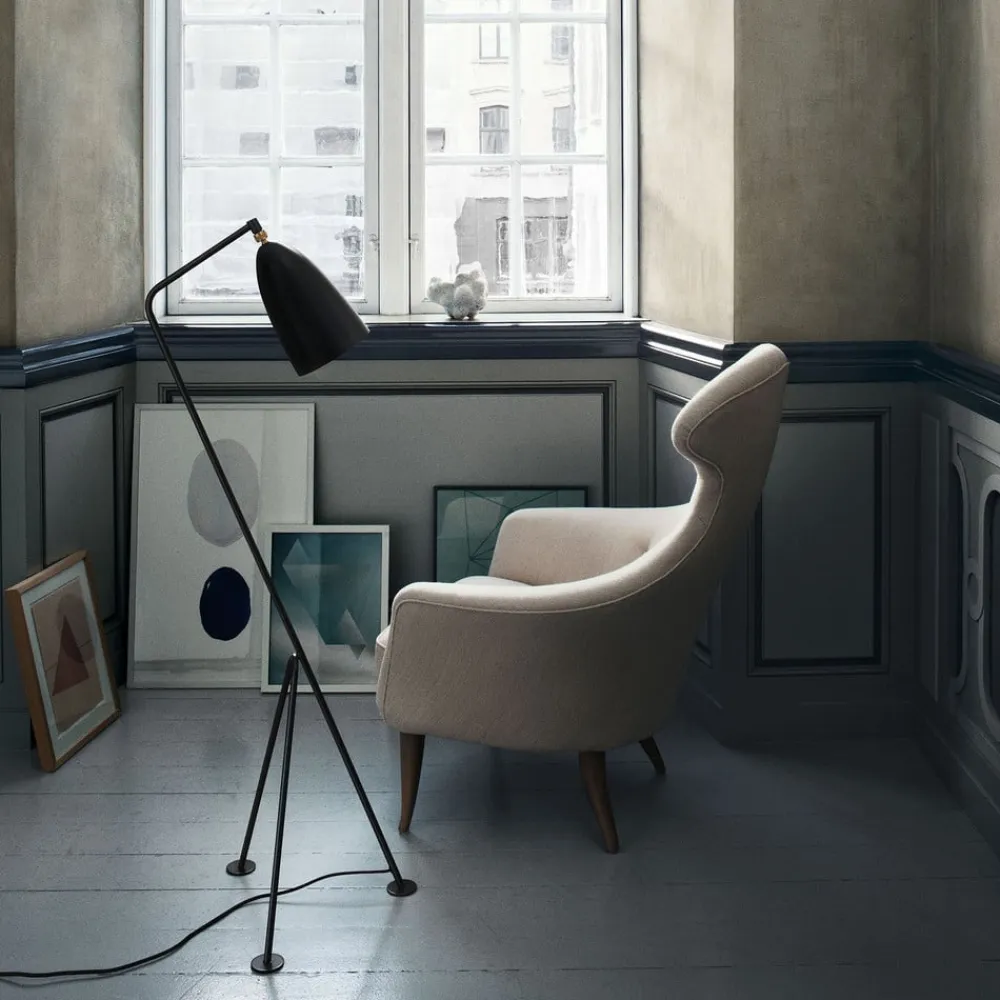 Gräshoppa designergulvlampe med justerbart hoved – et designikon af Greta Magnusson Grossman Gräshoppa-gulvlampen får et livligt præg af det let bagoverbøjede trebenede stel, hvilket gør den til et trendy indretningsaccessory til mange boligområder. Lampehovedet er konisk og kan justeres i sin retning, så lysretningen kan tilpasses individuelle behov. Gräshoppa tændes og slukkes nemt med en fodkontakt, der er integreret i forsyningskablet. Designet er skabt af den svenske designpioner Greta Magnusson Grossman og blev introduceret i 1947. Greta Magnusson Grossman (1906-1999) studerede på den anerkendte kunstskole Konstfack i Stockholm og åbnede sit eget atelier – en kombination af butik og værksted – i 1933. Efter at have giftet sig med jazzmusikeren Billy Grossman flyttede hun til Californien i 1940, åbnede en butik på den berømte Rodeo Drive i Los Angeles og var en af de første, der bragte den moderne skandinaviske stil til Nordamerika. Datidens prominente kunstnere som Joan Fontaine, Greta Garbo, Frank Sinatra og Ingrid Bergman var blandt hendes kunder. Den danske mærkevareproducent Gubi er førende inden for design og indretning: Virksomheden, der blev grundlagt i 1967 af Lisbeth og Gubi Olsen, opererer over hele verden og producerer designermøbler og belysning af høj kvalitet.