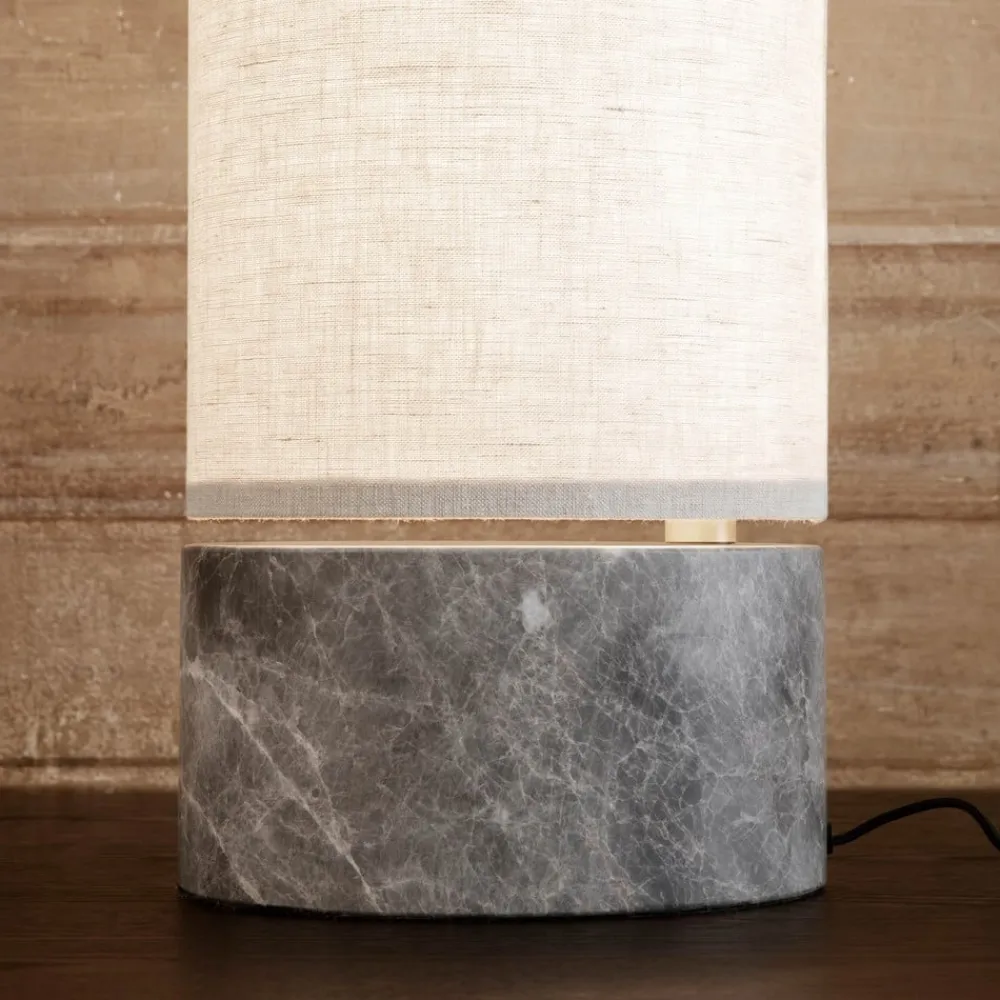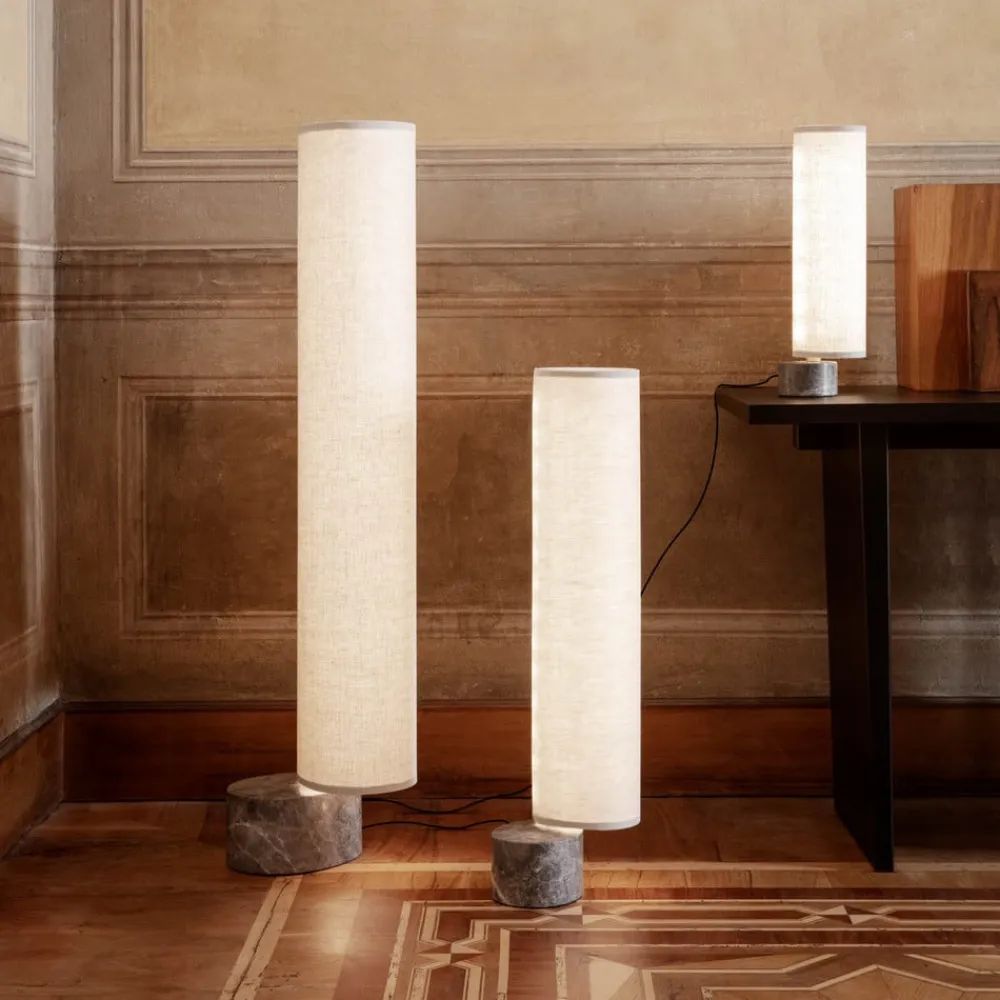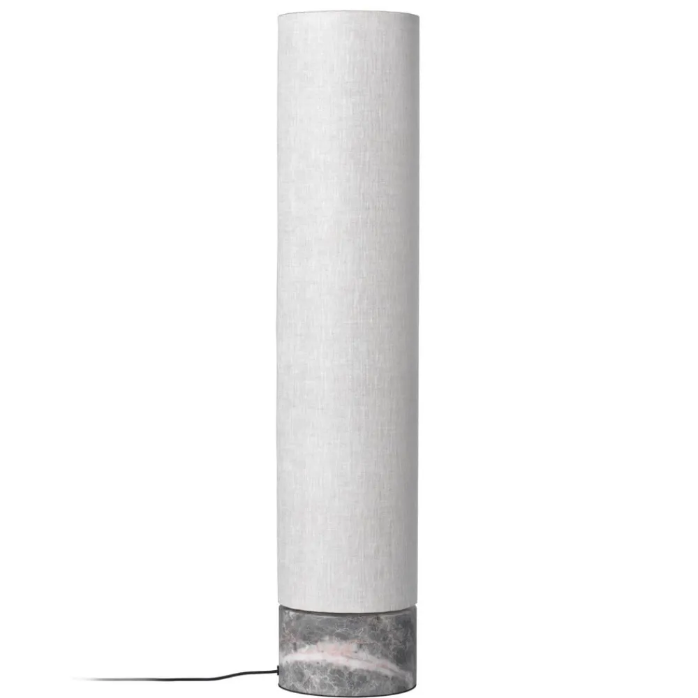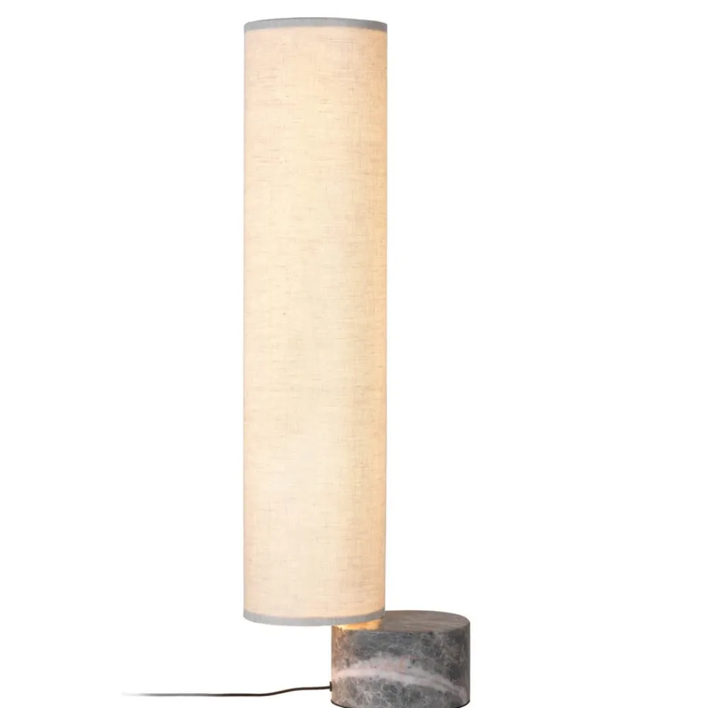 Denne LED-gulvlampe fra Space Copenhagen er inspireret af de japanske rispapirlamper. Soklen består af grå marmor, den lange skærm, der sidder over den i en ligeledes asymmetrisk dråbeform, er fremstillet af tekstil, i dette tilfælde af naturfarvet hørstof, hvis lette struktur giver det udstrålende LED-lys en vis flair. Skærmen kan drejes helt over bunden. Lyset kan reguleres trinløst via den indbyggede lysdæmper i kablet. LED-strømforsyning medfølger.