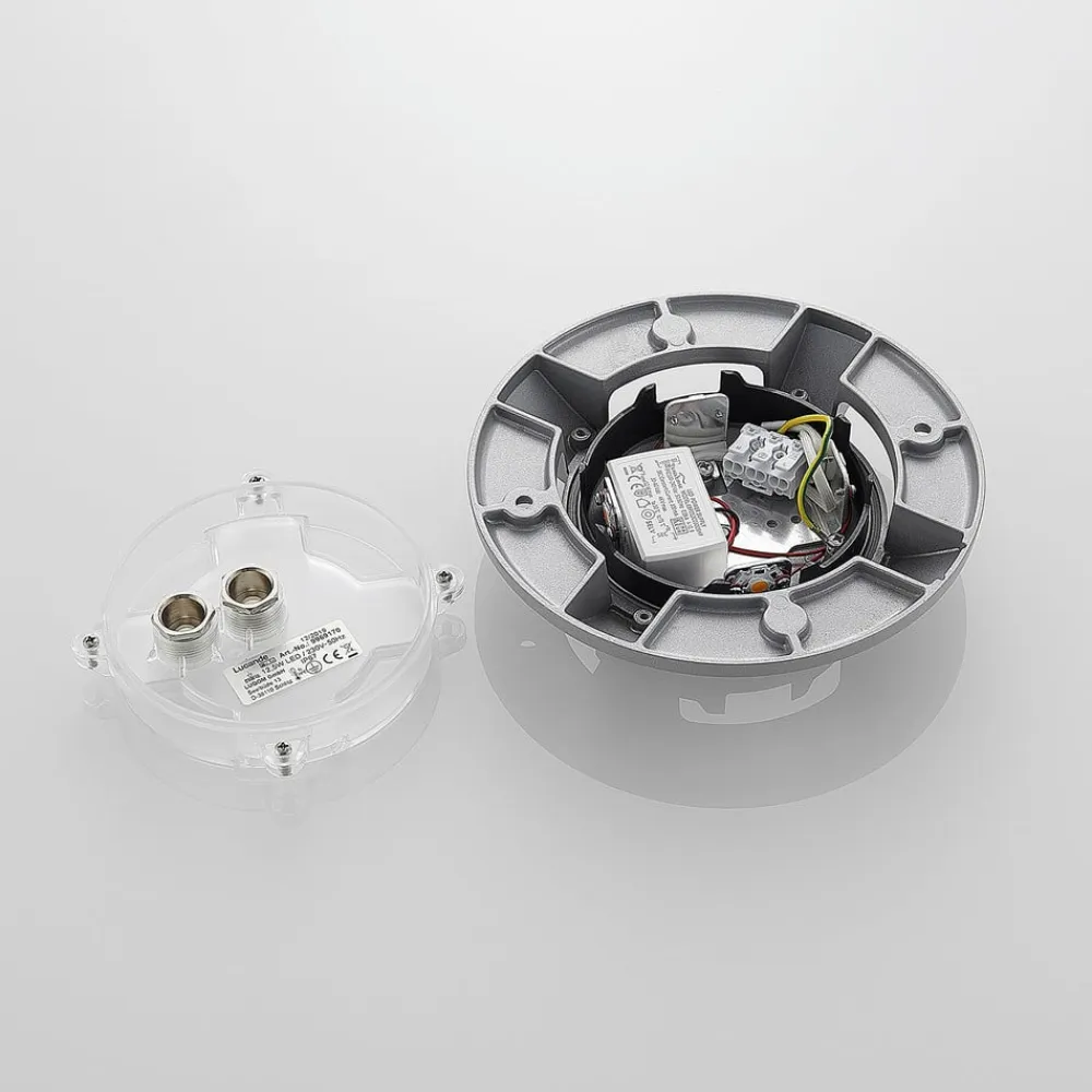 Jeffrey overbeviser med sin enkle, runde form og sit tidløse udseende. I modsætning til hvad man umiddelbart kunne tro, er lampen ikke en indbygget variant, men en relativt nem at montere gulvlampe, som man kan gå på, da den kan bære op til 500 kg. LED’erne er energibesparende, lyser varmhvidt og giver et blødt lys til udendørs brug, der er velegnet til orientering. Således kan man belyse havegange og steder i gården behageligt for at gøre snublefælder mere synlige. For at kunne forbinde flere lamper med hinanden er der mulighed for gennemgående kabelføring. Både kapslingsgraden (IP67) og slagfastheden (IK10) er høj, hvilket gør Jeffrey til en robust lampe til udendørs brug, hvis lys stråler ud i alle fire retninger.