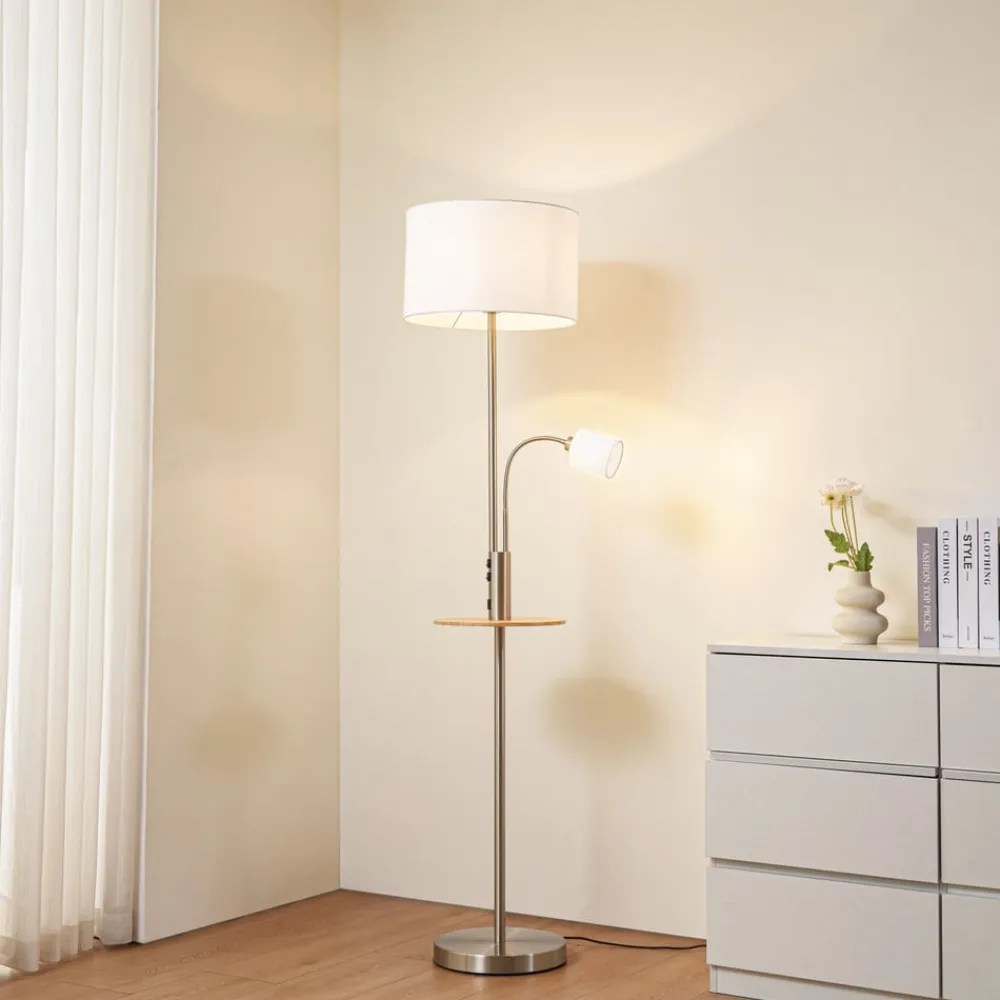 Nikkelfarvet gulvlampe Aovan med USB-opladestation og aflægningsflade