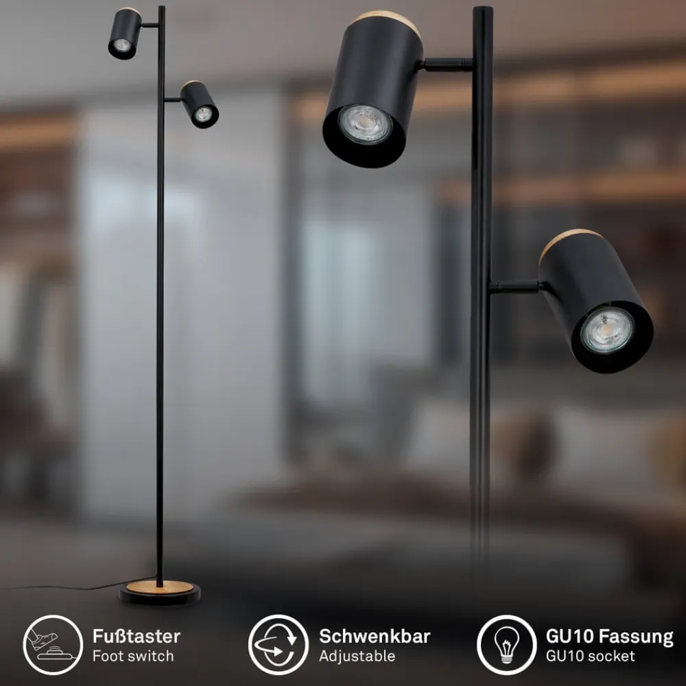 Gulvlampe Duta med 2 lyskilder: harmonisk kombination af metal og træ