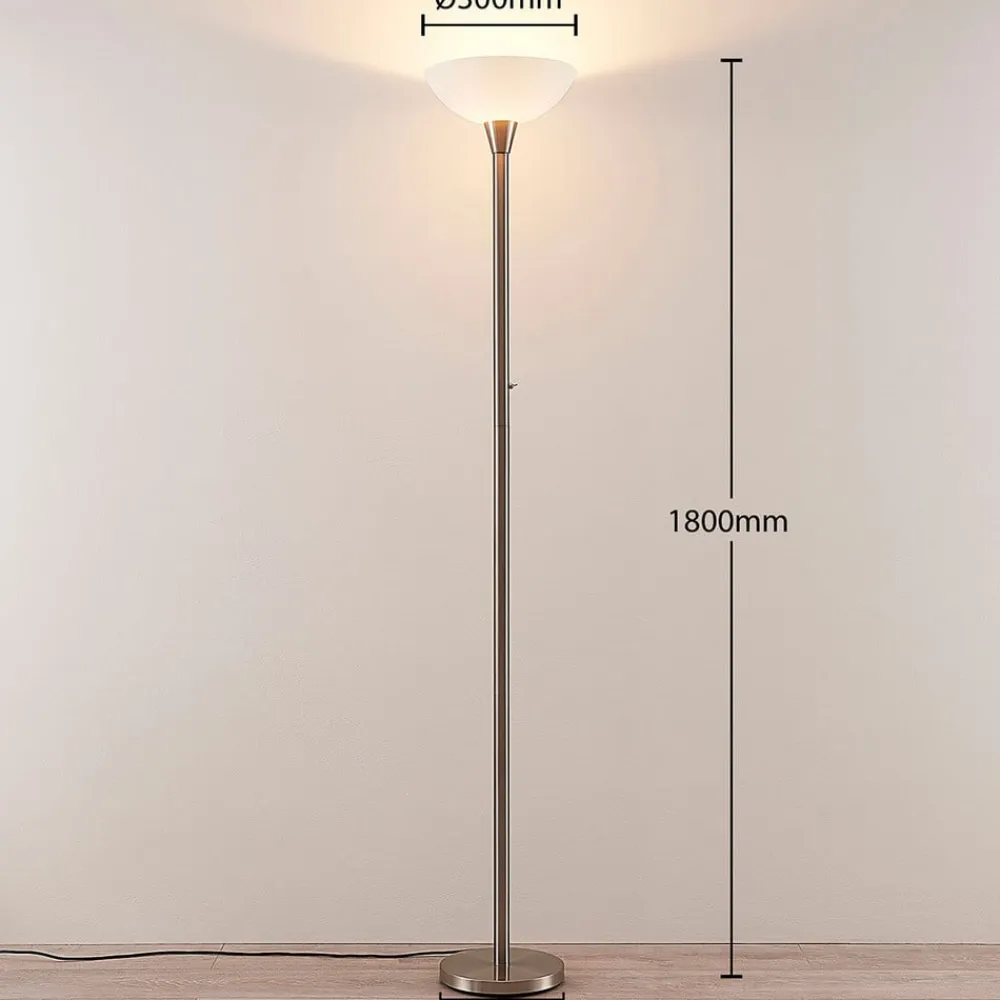 Nikkelfarvet uplight med lampeskærm i glas Skab flotte lysaccenter i dit hjem med denne gulvlampe. Ignacia-modellen er nem at tænde og slukke ved hjælp af en kontakt på stellet. Den har en E27-fatning og kommer i farven nikkel. Bring Lindby-kvalitet ind i dit hjem med denne gulvlampe. Ignacia-gulvlampen kombinerer fremragende lyskvalitet og attraktivt design.
