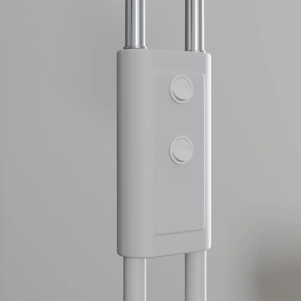 2 lyskilder gulvlampe Medira i skandinavisk stil med hvid finish og gylden skærm på indersiden Medira imponerer straks med sit minimalistiske design og stilfulde udtryk, hvilket gør den til den perfekte gulvlampe til skandinaviske boligstile, hvor disse egenskaber – dvs. fraværet af unødvendige detaljer og et stilfuldt overordnet design med et æstetisk formsprog – er særligt værdsat. Flexelementer i den øverste del af armaturet gør det muligt at justere de to identisk udseende lyskilder efter behov. Det betyder, at to personer kan nyde godt af fordelene ved gulvlampen, som er ideel som læselampe i stuen. Til dette formål kan de to lys også betjenes separat ved hjælp af to kontakter på lysrammen. Skærmene er tonet gyldne på indersiden, hvilket passer perfekt til det overordnede design og også tilføjer en varm tone til lysbilledet.