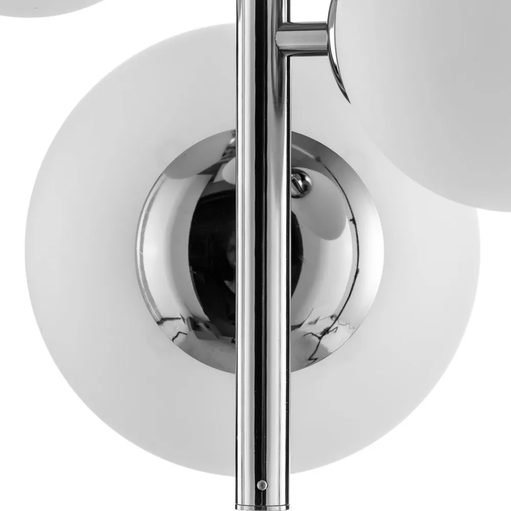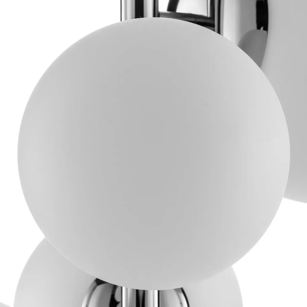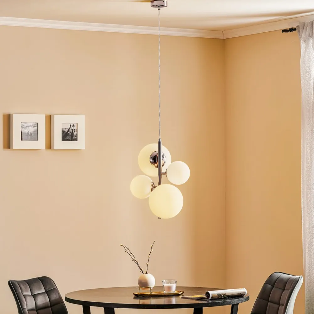 Hængelampen Dione, 4 lyskilder, krom, kombinerer moderne design med funktionel alsidighed. Den er fremstillet af metal og glas i høj kvalitet og præsenterer sig i en stilfuld kombination af hvidt frostet og kromfarvet finish. Denne lampe er ideel til moderne boliger som stuer, køkkener og spisestuer og giver en imponerende lyseffekt, der skaber en helt særlig stemning i ethvert rum.