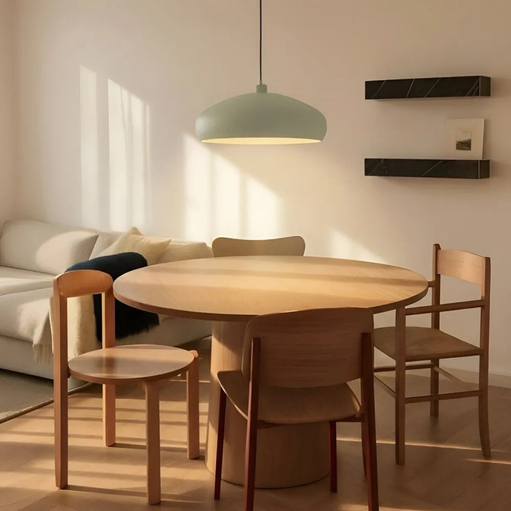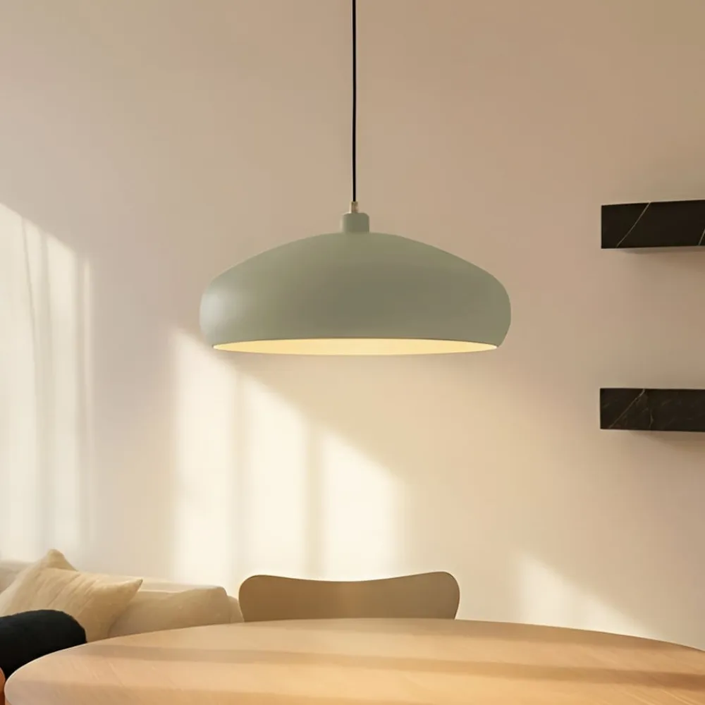 Elover 1-lys hængelampe i en blød grøn farve Elover 1-lys hængelampe er lavet af jern. Den runde skærm er uigennemsigtig hele vejen rundt og åbner kun nedad. Det gør, at det genererede lys kan strømme direkte nedad og f.eks. belyse bordflader i stor udstrækning. Indersiden af skærmen reflekterer forsigtigt lyset ud i omgivelserne og understreger Elovers smukke lysegrønne farve.
