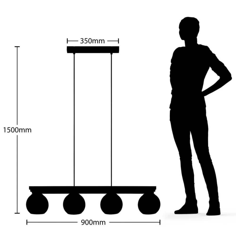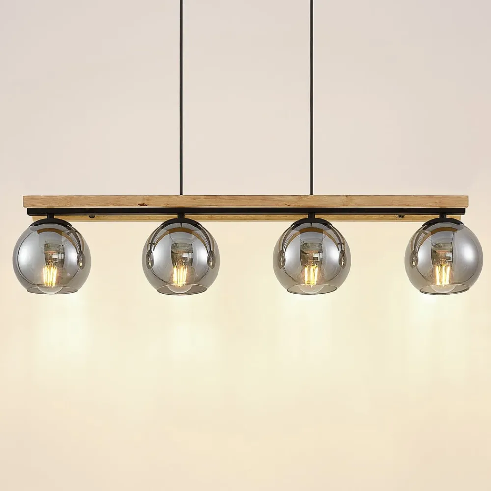 4 lyskilder Enrique pendellampe til spisestuen med sfæriske skærme af elegant røgfarvet glas Enrique imponerer med et glamourøst touch og fire røgfarvede skærme af sfærisk glas, som er absolut trendy med deres design og bidrager til en smuk lyseffekt i opholds- og spiseområdet. De holdes på plads af en træbjælke med et elegant egetræslook, der giver pendellampen et naturligt flair. De to materialer og deres farvedesign supplerer hinanden og skaber en harmonisk helhed med et stilfuldt udtryk. Takket være sin aflange form er pendellampen med sine E27-fatninger, som kan monteres efter behov – ideelt set med stilfulde LED-filamentpærer – ideel til at oplyse et bord i spiseområdet.