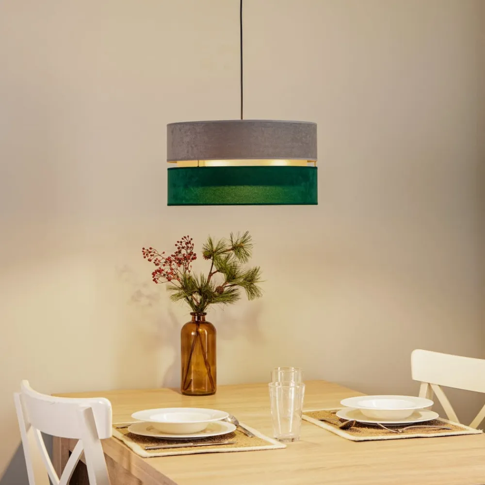 Hængelampen Golden Duo forener stilfuld elegance med et unikt farvespil i grå, mørkegrøn og guld. Den er fremstillet af fløjl i høj kvalitet og giver ethvert rum en luksuriøs atmosfære. Uanset om den hænger i stuen, soveværelset eller spisestuen, sætter denne lampe accenter og skaber en harmonisk stemning. Muligheden for at dæmpe lyset via en ekstern dæmper gør det muligt at tilpasse lysintensiteten individuelt og dermed skabe den ønskede stemning.